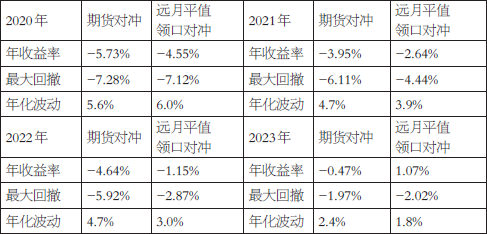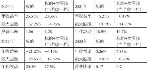 图为2020年—2023年净值 由上图及下表可以看出,采用卖出看涨期权备兑策略的净值曲线在大部分时间段内具备一定的收益增强效果,在标的出现震荡或者小幅下跌的情况下更为适用。当然,在标的出现大幅上涨时,由于卖出看涨期权会提前锁定资产上涨部分带来的收益,因此净值会不及标的。不过,针对这类情况,可以灵活调整,如向上移仓或转换策略。
