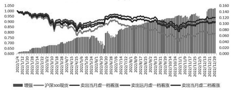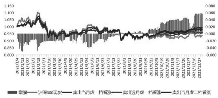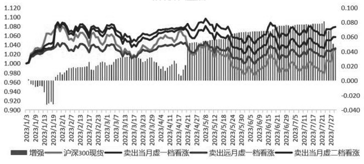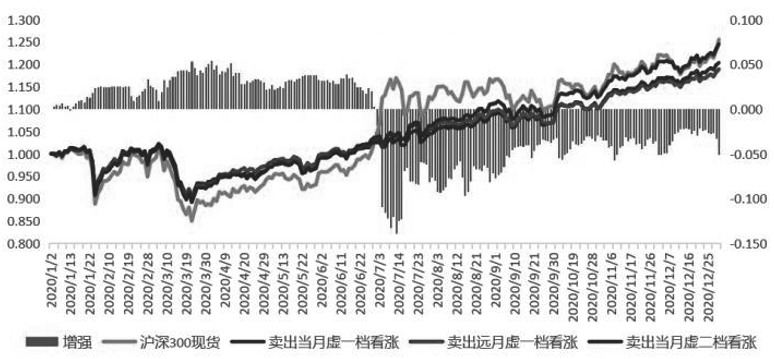 图为卖出看涨策略 总结备兑增收策略的使用场景:一是增强持股收益,就是持有标的短期不温不火,长期被套,这种情况下通过卖出看涨来降低成本或增强收益。二是锁定卖出价为执行价,也就是说投资者手里的货没有到一定价位,比较惜售,迟迟不肯出货,希望再涨一点,此时就可以卖出心理价位的看涨期权,涨上去后就通过履约形式高位出货,而且收到了权利金又相当于把卖出价进一步提高。 以下是对近四年的卖出看涨备兑策略回测,分别选择卖当月虚一档、当月虚二档、远月虚一档做对比,柱状部分是对裸持标的的增强部分。