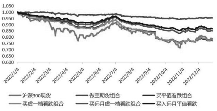 图为买入看跌对冲策略 以下是对近四年用保护性看跌策略的回测,分别用做空期货和买看跌期权对冲,买看跌又分为买当月平值、当月虚一档、远月平值及远月虚一档。期货、期权均等市值对冲(1000万元名义本金),对冲时被动建仓和持仓,不择时,换月移仓按期货成交量标准。