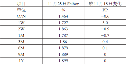 近期,市场利率呈现“短弱长强”态势。一方面,随着月中缴税、缴款期的结束,资金短期需求下降,短期利率走低。另一方面,随着年底的临近,企业开始回笼资金,资金需求增加,中长期利率稳中有升。11月25日,上海银行间同业拆放利率(Shibor)隔夜、2周、1个月期分别报收于1.464%、1.863%、1.787%,较11月18日分别下行0.6、0.9、0.7个基点;1周、3个月、6个月期利率分别报收于1.727%、1.86%、1.879%,较11月18日分别上升3.0、0.4、0.1个基点。9个月、1年期利率分别报收于1.889%、1.899%,与11月18日持平。