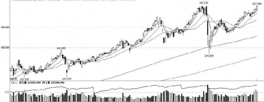 T加权强势依旧,有望再创新高,且量仓等指标逐渐趋同。周一早盘略低开后震荡上行,盘中表现强势。T主连合约大幅加仓,远月合约亦明显增仓,但近月合约大幅减仓,总体仓位增加较多,且成交量能较前几个交易日明显增加。T加权MACD红柱未见收敛,KDJ快线在高位运行,日K线上行动力较足且受短期均线支撑。短期市场表现强势,投资者可关注T加权创新高后的回踩幅度,建议多单持有。(田瑞 期货投资咨询证编号TZ008852) (责任编辑:迷你学人) |
