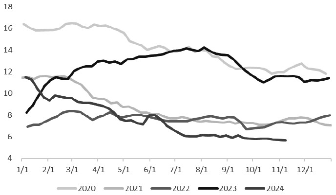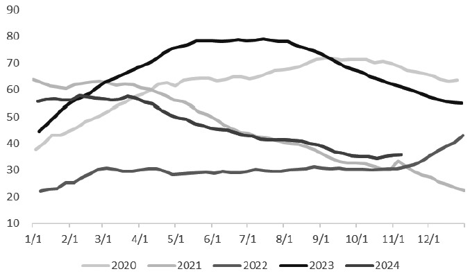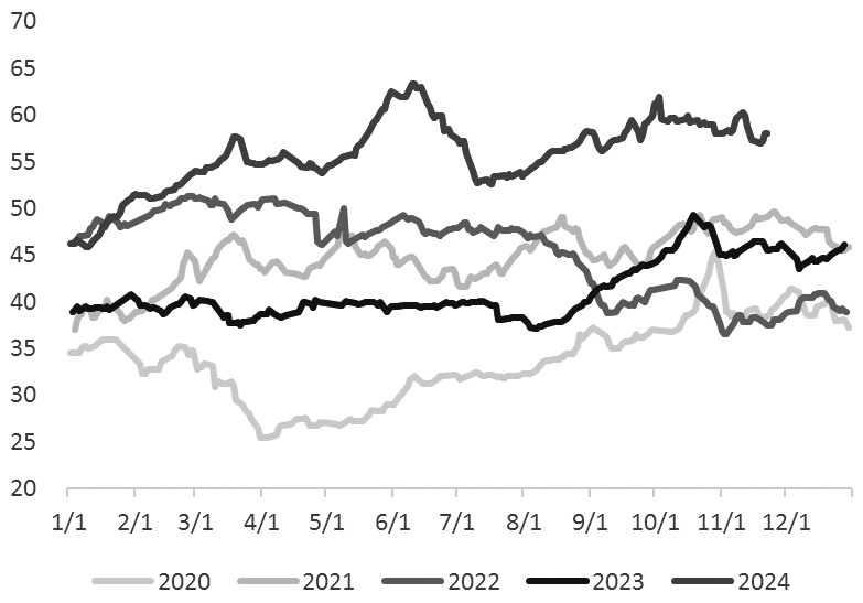 11月以来,橡胶期货板块上涨乏力,其中,天然橡胶(RU)和20号胶(NR)冲高回落,且均跌破10月价格运行区间下沿,而丁二烯橡胶(BR)则走出流畅的下跌趋势行情。橡胶期货板块内部呈现明显的强弱分化,主要原因在于原料价格走势的差异。随着美国大选结束,美元强势上涨,宏观面对国内商品偏空,板块交易逻辑回归基本面。在青岛天然橡胶累库的影响下,现货紧张的情况有所缓解,RU和NR上方承压,但泰国原料价格仍支撑天然橡胶。由于丁二烯的暴跌,BR回归成本定价逻辑,跟随丁二烯持续下跌,跌幅远高于RU和NR。 展望后市,天然橡胶方面,预计短期美元维持强势,对国内商品市场影响偏空,但随着国内天然橡胶产区临近停割,以及未来两周内泰国南部降雨预期增加,原料价格有望反弹走高,进而支撑RU和NR,关注RU2501和NR2501合约分别在17000元/吨和13500元/吨附近的支撑。中长期来看,考虑到年底国内产区停割、明年欧盟零毁林法规(EUDR)实施的影响以及泰国启动2025财年“橡胶延缓销售”项目,利多因素有望在今年年底以及明年一季度逐步累积。合成橡胶方面,预期丁二烯仍有下行空间,但天然橡胶短期仍有上行驱动,且当前泰国混合胶与顺丁橡胶的价差高于2500元/吨,容易引起下游轮胎厂的替换需求,对BR形成一定的支撑。所以,BR不宜过分看空,关注BR2501合约在12000元/吨附近的支撑。另外,在顺丁橡胶高开工的现实下,需关注需求端对顺丁橡胶工厂库存的影响。 [天然橡胶] [天气扰动叠加国内产区临近停割仍有上行驱动] 近期行情分析 10月,泰国胶水价格回落趋势形成,杯胶表现相对坚挺;11月初,胶水大跌,但杯胶却小幅上涨,胶水与杯胶的价差下跌至年内新低;随后由于泰国南部降雨,影响割胶,表明胶水超跌,使得泰国天胶原料反弹,胶水与杯胶价差走扩,RU与NR主力合约反弹冲高。但随着国内外宏观落地,美元强势上涨,对国内商品偏空,且天然橡胶回归基本面,泰国杯胶价格持续下跌,市场开始交易青岛天胶库存累积和天然橡胶供应上量预期,RU和NR未能突破前高并回落。 ![]() 图为天然橡胶青岛保税区库存(单位:万吨) ![]() 图为天然橡胶青岛一般贸易库存(单位:万吨) 主产区供应情况 国内方面,海南产区近期降水扰动持续,影响割胶工作推进,原料产出季节性增量受限,且伴随着海南天气出现降温,中部、东部地区新鲜胶水的干胶含量下降。另外,目前市场原料流通量较为有限,当地加工厂仍需加价收购。而云南产区近期天气情况尚可,割胶工作正常开展,多数胶林预计在11月底停割,原料胶水减量明显。此外,加工厂目前开工尚可,冬储备料进度一般,进口原料多来自老挝,部分工厂目前原料库存可维持两个月左右的正常生产。 泰国方面,根据机构消息,前期原料二盘商超卖,当前积极补货交货,且泰国橡胶管理局(RAOT)于近日宣布正式启动2025财年的“橡胶延缓销售”计划,对原料价格形成支撑,原料收购价格止跌反弹。泰国东北部产区维持旺产,工厂原料库存在2~3个月,工厂远期出货积极,多为国内套利盘加仓买货,海外市场则维持刚需买盘。泰国南部产区适逢雨季,根据美国国家气象局(NWS)的降雨预测,未来两周内泰国南部雨水有增加预期,部分区域由于雨水过多导致橡胶树引发病虫害,原料收购价格有上行驱动。 欧盟零毁林法案(EUDR)推迟执行的影响 11月14日,欧洲议会投票通过了将欧盟零毁林法规的实施推迟12个月,并通过了一系列修正案以削弱该法律。该投票结果基本符合市场预期,以下就EUDR推迟执行的短期影响和中长期影响进行分析。 从今年欧盟天然橡胶的进口情况来看,欧盟在今年二、三季度大量进口符合EUDR标准的天然橡胶,并且市场推测EUDR的实施是影响今年泰国出口到中国的天然橡胶数量同比下滑的一个原因。据此,我们认为EUDR推迟实施造成的短期影响为:今年四季度与明年一季度,欧盟对天然橡胶的补库需求或下滑,导致部分泰国出口至欧盟的天然橡胶或流向中国,使得青岛天然橡胶库存累积。中长期影响为:由于EUDR推迟一年执行,今年欧盟二、三季度对天然橡胶补库的行为以及泰国天然橡胶出口分流,很有可能在2025年重演,因此,EUDR在明年依然利好天然橡胶。 ![]() 图为泰国胶水价格(单位:泰铢/公斤) ![]() 图为泰国杯胶价格(单位:泰铢/公斤) [合成橡胶] [成本端仍在寻底成为近期影响走势的主要原因] 天然橡胶与原料丁二烯价格是合成橡胶期货价格走势的两个重要参考。国庆节后,橡胶板块经历一波下跌,随后进入区间震荡阶段,一直持续至10月底。然而在11月初,市场围绕泰国降雨和泰混现货偏紧进行交易,RU反弹冲高,但BR却持续下行。橡胶板块内部强弱分化的原因在于丁二烯供应充裕,使得BR大幅下挫,且天然橡胶上行驱动有限,使得RU对BR的支撑作用远不及丁二烯的向下拖拽作用,所以,BR估值持续下跌,丁二烯成为近期影响BR走势的主要因素。 丁二烯国内供应方面,今年以来,丁二烯新装置投产一再推迟,9月中下旬金诚石化6万吨/年丁二烯装置投料开车,但10月初停车,预计12月左右重启,因此,今年第一套丁二烯新装置投产后正常运行的是11月初投产的中石化英力士(天津)17万吨/年丁二烯装置。此外,根据机构消息,11月底至12月,国内将有多套丁二烯装置重启或投产,南京诚志10万吨/年丁二烯氧化脱氢装置计划在近期重启,这套装置从2022年7月停车至今,同时裕龙石化20万吨/年丁二烯装置计划11月底投产,