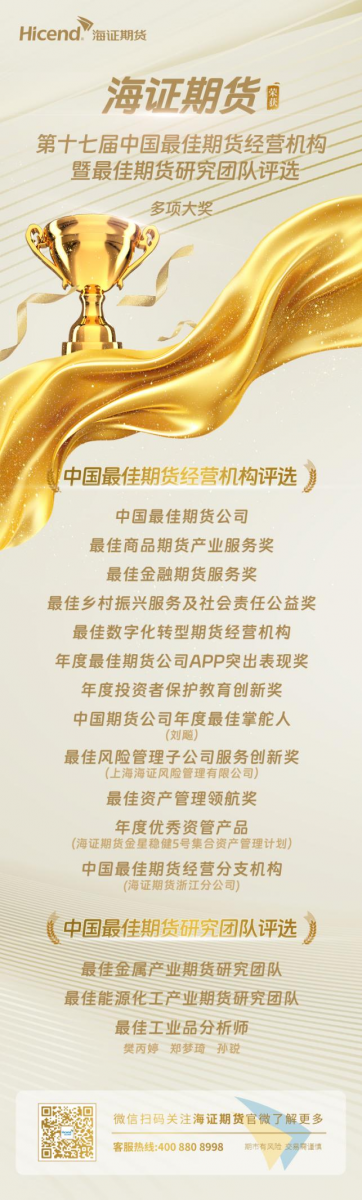 2024年11月27日,由期货日报社联合证券时报社共同主办的“2024年期货业高质量发展创新研讨会暨第十七届中国最佳期货研究团队评选颁奖典礼”在江苏南京圆满落幕。 海证期货荣获中国最佳期货公司、最佳商品期货产业服务奖、最佳金融期货服务奖、最佳乡村振兴服务及社会责任公益奖、年度最佳期货公司APP突出表现奖、年度投资者保护教育创新奖、最佳数字化转型期货经营机构,海证期货董事长刘飚先生荣获中国期货公司年度最佳掌舵人,海证风险荣获最佳风险管理子公司服务创新奖,海证期货浙江分公司荣获中国最佳期货经营分支机构,海证期货资产管理总部荣获年度最佳资产管理领航奖,海证期货金星稳健5号集合资产管理计划荣获年度优秀资管产品,海证期货研究所荣获最佳金属产业期货研究团队和最佳能源化工产业期货研究团队,研究员郑梦琦、樊丙婷、孙锐荣获最佳工业品期货分析师称号。 此次荣获多项殊荣,是对海证期货综合实力与专业技能方面的肯定,更是对海证不懈追求高质量发展的坚定支持与鼓舞。站在全新的发展阶段,海证期货致力于深化金融科技融合,强化智能服务效能,并持续优化安全体系架构,力求打破传统金融服务界限,实现服务范围的广泛拓展,为客户提供更为便捷、高效、安全的期货服务体验。在服务实体经济的过程中,海证期货将不断探索创新服务模式,将专业的风险管理服务深度融入产业链各节点,提升整体定价效率,促进产业链上下游的均衡发展与高质量成长,为实体企业实现保供稳价目标提供坚实支撑。通过场外衍生品交易、基差贸易、期现结合等多种方式,全方位提供风险管理解决方案,为客户打造集成化、一站式的期货服务体验。 海证期货将继续秉承“诚信、远见、绩效、专业、和谐”的经营宗旨,以更加昂扬的斗志和扎实的行动,服务实体经济,充分发挥期货市场的价值功能,为加速构建金融强国、推动中国式现代化进程贡献力量。