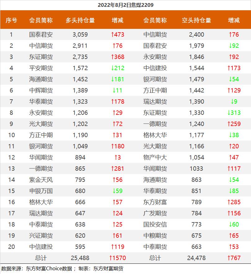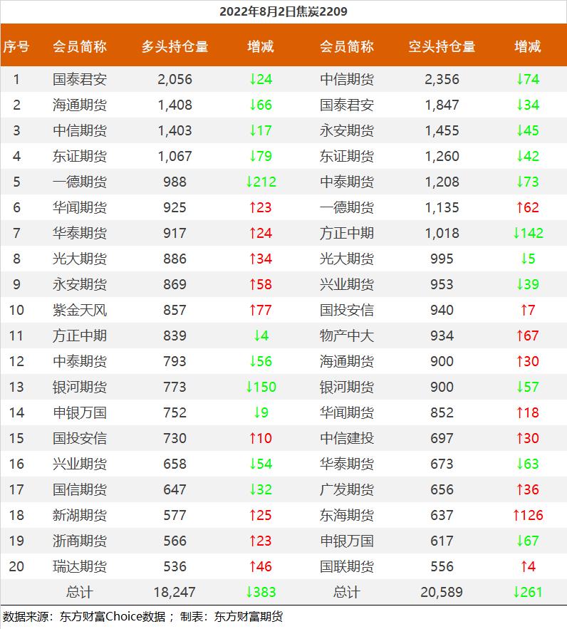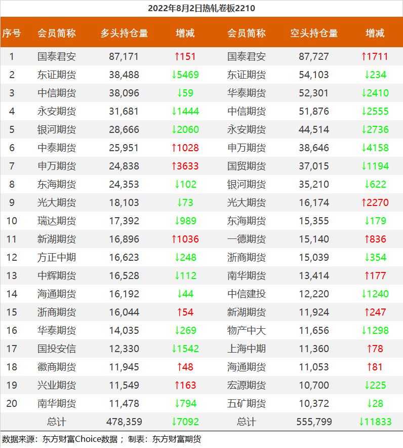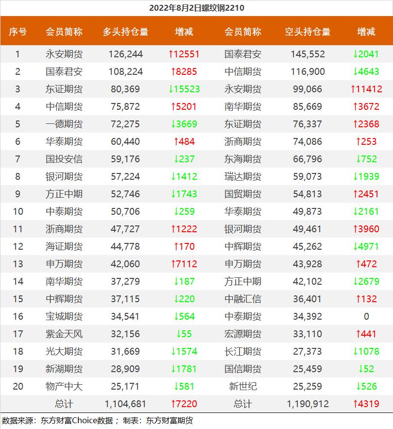 | 截至8月2日收盘,螺纹钢2210收4104元/吨,涨0.49%;热卷2210收4053元/吨,涨0.22%;铁矿石2209收807元/吨,涨1.45%;焦炭2209收2955.5元/吨,涨2.11%;焦煤2209收2256.5元/吨,涨3.7%。 螺纹钢2210合约前20席位多单增仓7220手至110.5万手,空单增仓4319手至119.1万手,整体净空86231手。其中永安期货多单增持近1.3万手,整体净多27178手。 各品种具体如下: ![]() 各品种持仓情况具体如下: ![]() ![]() ![]() ![]() ![]() |