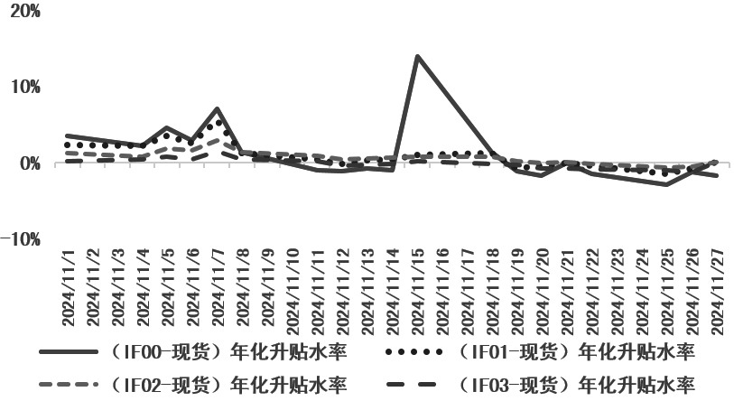 政策预期在市场上已经得到了充分反应,预计股指后续仍然以蓄势整理为主,等待外部因素逐步明朗后,市场关注点将重新回到国内。 11月上旬,股指整体仍然以震荡偏多的走势为主,相对应的股指期货中IH和IF当月合约保持明显升水,IC和IM当月合约虽然仍以贴水为主,但个别交易日出现升水。11月18日以来,除了IH品种,其他三个品种的贴水幅度均有明显扩大的迹象,其间行情走势转弱,IC和IM贴水扩大较为明显。我们认为,这与小盘股开始高位回调整理有关,推测部分机构资金开始增加套保对冲仓位。11月以来,IH远月合约仍然保持升水,IF远月合约开始转为小幅贴水,IC和IM远月合约保持贴水状态。