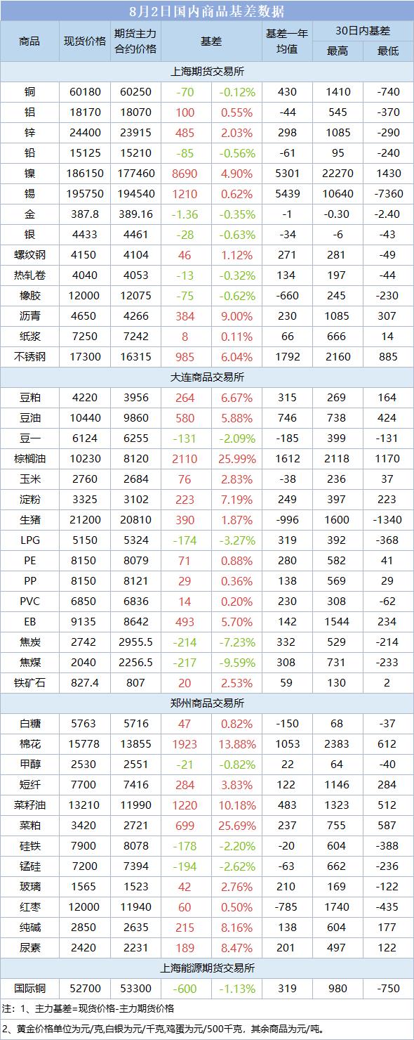 基差报告:8月2日国内商品基差数据一览