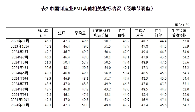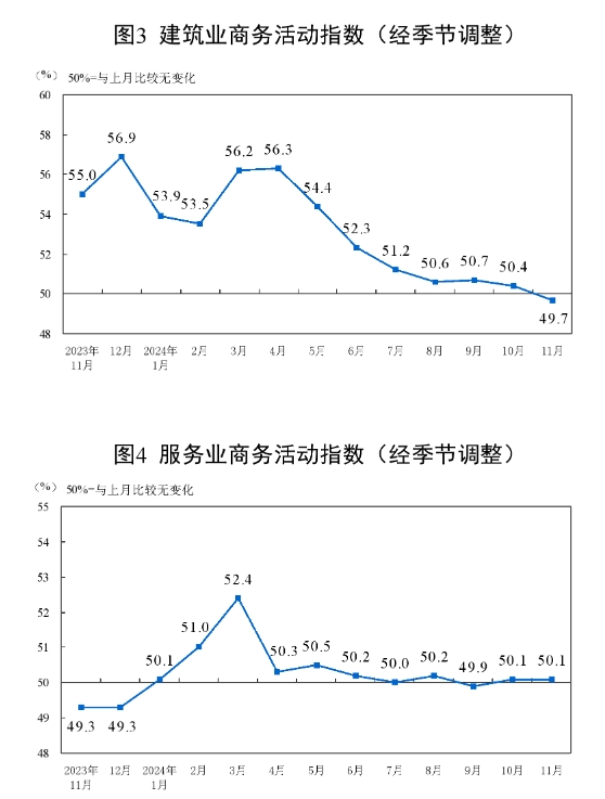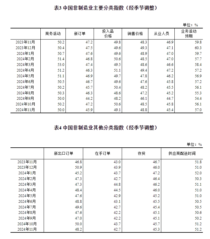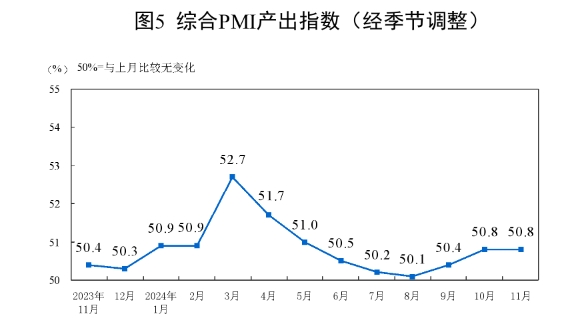 一、中国制造业采购经理指数运行情况 11月份,制造业采购经理指数(PMI)为50.3%,比上月上升0.2个百分点,制造业扩张步伐小幅加快。 ![]() 从企业规模看,大型企业PMI为50.9%,比上月下降0.6个百分点,高于临界点;中型企业PMI为50.0%,比上月上升0.6个百分点,位于临界点;小型企业PMI为49.1%,比上月上升1.6个百分点,低于临界点。 从分类指数看,在构成制造业PMI的5个分类指数中,生产指数、新订单指数和供应商配送时间指数高于临界点,原材料库存指数和从业人员指数低于临界点。 生产指数为52.4%,比上月上升0.4个百分点,表明制造业企业生产活动进一步加快。 新订单指数为50.8%,比上月上升0.8个百分点,表明制造业市场需求景气水平有所回升。 原材料库存指数为48.2%,与上月持平,仍低于临界点,表明制造业主要原材料库存量较上月下降。 从业人员指数为48.2%,比上月下降0.2个百分点,表明制造业企业用工景气度有所回落。 供应商配送时间指数为50.2%,比上月上升0.6个百分点,高于临界点,表明制造业原材料供应商交货时间有所加快。 ![]() ![]() 二、中国非制造业采购经理指数运行情况 11月份,非制造业商务活动指数为50.0%,比上月下降0.2个百分点,位于临界点,非制造业景气水平小幅回落。 ![]() 分行业看,建筑业商务活动指数为49.7%,比上月下降0.7个百分点;服务业商务活动指数为50.1%,与上月持平。从行业看,电信广播电视及卫星传输服务、互联网软件及信息技术服务、货币金融服务、资本市场服务、保险等行业商务活动指数均位于55.0%以上较高景气区间;批发、零售、住宿、餐饮、生态保护及公共设施管理等行业商务活动指数低于临界点。 ![]() 新订单指数为45.9%,比上月下降1.3个百分点,表明非制造业市场需求景气水平回落。分行业看,建筑业新订单指数为43.5%,与上月持平;服务业新订单指数为46.4%,比上月下降1.4个百分点。 投入品价格指数为49.1%,比上月下降1.5个百分点,表明非制造业企业用于经营活动的投入品价格总体水平有所下降。分行业看,建筑业投入品价格指数为48.0%,比上月下降7.2个百分点;服务业投入品价格指数为49.3%,比上月下降0.5个百分点。 销售价格指数为48.8%,比上月上升0.3个百分点,仍低于临界点,表明非制造业销售价格总体水平降幅继续收窄。分行业看,建筑业销售价格指数为48.6%,比上月下降3.5个百分点;服务业销售价格指数为48.8%,比上月上升1.0个百分点。 从业人员指数为45.4%,比上月下降0.4个百分点,表明非制造业企业用工景气度有所回落。分行业看,建筑业从业人员指数为40.7%,比上月下降2.0个百分点;服务业从业人员指数为46.2%,比上月下降0.2个百分点。 业务活动预期指数为57.0%,比上月上升0.9个百分点,表明非制造业企业对近期市场预期继续改善。分行业看,建筑业业务活动预期指数为55.6%,比上月上升0.4个百分点;服务业业务活动预期指数为57.3%,比上月上升1.1个百分点。 ![]() 三、中国综合PMI产出指数运行情况 11月份,综合PMI产出指数为50.8%,与上月持平,表明我国企业生产经营活动总体继续扩张。 ![]() 附注 1、主要指标解释 采购经理指数(PMI),是通过对企业采购经理的月度调查结果统计汇总、编制而成的指数,它涵盖了企业采购、生产、流通等各个环节,包括制造业和非制造业领域,是国际上通用的监测宏观经济走势的先行性指数之一,具有较强的预测、预警作用。综合PMI产出指数是PMI指标体系中反映当期全行业(制造业和非制造业)产出变化情况的综合指数。PMI高于50%时,反映经济总体较上月扩张;低于50%,则反映经济总体较上月收缩。 2、调查范围 涉及《国民经济行业分类》(GB/T4754-2017)中制造业的31个行业大类,3200家调查样本;非制造业的43个行业大类,4300家调查样本。 3、调查方法 采购经理调查采用PPS(Probability Proportional to Size)抽样方法,以制造业或非制造业行业大类为层,行业样本量按其增加值占全部制造业或非制造业增加值的比重分配,层内样本使用与企业主营业务收入成比例的概率抽取。 本调查由国家统计局直属调查队具体组织实施,利用国家统计联网直报系统对企业采购经理进行月度问卷调查。 4、计算方法 (1)分类指数的计算方法。制造业采购经理调查指标体系包括生产、新订单、新出口订单、在手订单、产成品库存、采购量、进口、主要原材料购进价格、出厂价格、原材料库存、从业人员、供应商配送时间、生产经营活动预期等13个分类指数。非制造业采购经理调查指标体系包括商务活动、新订单、新出口订单、在手订单、存货、投入品价格、销售价格、从业人员、供应商配送时间、业务活动预期等10个分类指数。分类指数采用扩散指数计算方法,即正向回答的企业个数百分比加上回答不变的百分比的一半。由于非制造业没有合成指数,国际上通常用商务活动指数反映非制造业经济发展的总体变化情况。 (2)制造业PMI指数的计算方法。制造业PMI是由5个扩散指数(分类指数)加权计算而成。5个分类指数及其权数是依据其对经济的先行影响程度确定的。具体包括:新订单指数,权数为30%;生产指数,权数为25%;从业人员指数,权数为20%;供应商配送时间指数,权数为15%;原材料库存指数,权数为10%。其中,供应商配送时间指数为逆指数,在合成制造业PMI指数时进行反向运算。 (3)综合PMI产出指数的计算方法。综合PMI产出指数由制造业生产指数与非制造