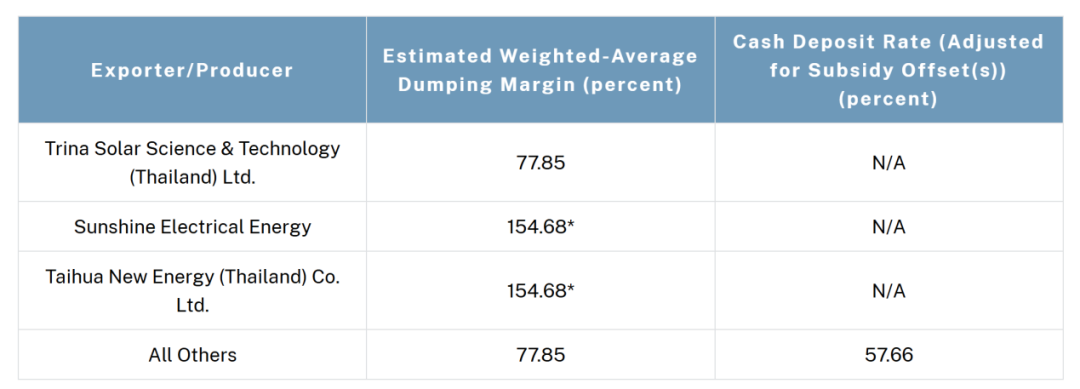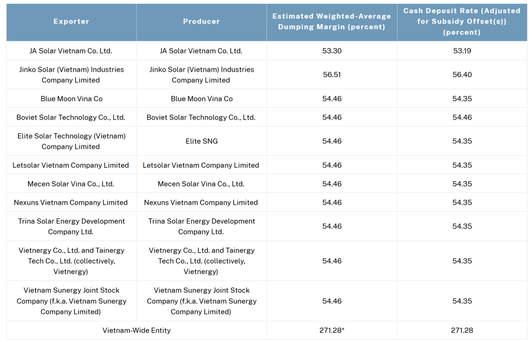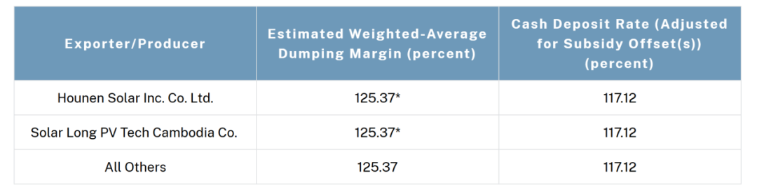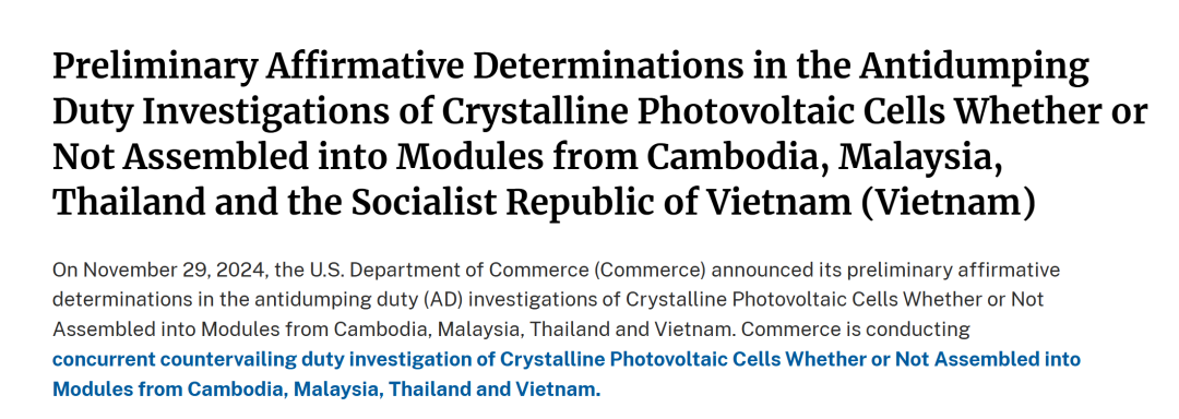 美国出手了。 当地时间11月29日,美国商务部公布其对东南亚四国柬埔寨、马来西亚、泰国和越南晶体光伏电池(无论是否组装成组件)反倾销税调查的初步肯定性裁定:四国反倾销税率范围在0—271.28%。但最终结果将在2025年年中公布。 ![]() 美国商务部公告截图 调查起因 2024年4月,美国太阳能制造贸易联盟委员会向美国商务部提交“双反调查”(反倾销、反补贴)申请。5月,美国商务部启动对东南亚四国的“双反调查”。反补贴初裁结果早前已公布,相较最新公布的反倾销税率,反补贴税率较低。国内主要光伏企业的反补贴税率为0.81%—8.25%。