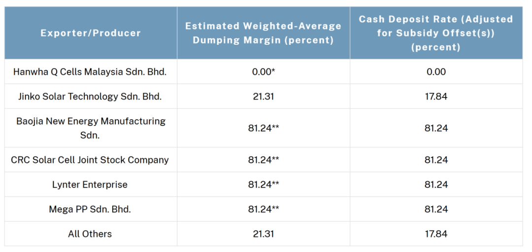 从此次发布的公告看,美国商务部对东南亚四国的电池光伏企业反倾销税率范围在0—271.28%。其中,韩华Hanwha Qcell马来西亚反倾销税率为0,Vietnam-Wide Entity越南反倾销税率为271.28%。 不过,这一裁定只是初步结果,最终结果预计将于2025年年中确定。 ![]() 柬埔寨受影响企业 ![]() 马来西亚受影响企业 ![]() 泰国受影响企业 ![]() 越南受影响企业 中国企业受影响 由于多家中国光伏企业在东南亚有布局,从美国商务部对东南亚四国光伏产业“双反”正式调查开始,中国企业的受影响程度引发市场关注。 东方财富证券研究员周旭辉和唐硕的研究报告认为,美国自2012年以来先后对进口光伏产品施加多轮贸易壁垒,主要包括:1)对中国及中国台湾地区的“双反”调查;2)201关税;3)301关税;4)UFLPA法案;5)东南亚反规避调查等,五轮贸易制裁下国内光伏企业及配套辅材通过向东南亚转移产能规避关税限制,进入美国高溢价市场。 该报告预计,“双反”落地后,四国输美优势将大幅削弱甚至不具备输美能力。同时,在IRA补贴扶持下,美国本土光伏组件产能快速起量。预计未来美国光伏供给格局将由东南亚一体化输美转变为“进口材料+本地组件”形式为主。 隆基绿能董事长钟宝申曾在2024年中期业绩说明会期间表示:“未来东南亚四国的产能再进入美国市场将会被征税。因为税率太高,未来越南的产能应该不具备进入美国的条件了;马来西亚和泰国出口组件没机会,电池还有市场机会。” 就“明年东南亚如果不能出口美国,怎么补充美国出货?”的问题,晶澳科技10月31日在路演活动中表示,美国市场仍会持续出货,还有订单交付以及部分库存,后续如果美国对东南亚四国的双反税率较高,公司可以从美国组件工厂发货满足供应。同时,公司也在考察美国和东南亚四国之外其他国家的产能投资机会。 (文章来源:证券时报) (责任编辑:迷你学人) |