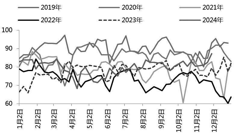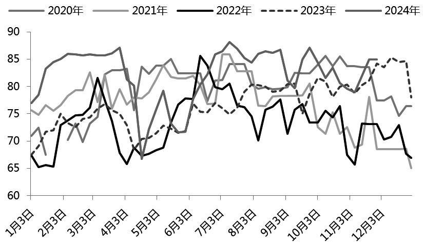 图为国内PX开工率走势(单位:%) 从原料PX来看,四季度因国内部分PX装置检修叠加海外部分重整装置减产,亚洲及国内PX负荷有所下降,且下游PTA装置检修计划不多以及12月中下旬存新装置投产预期,四季度PX供应压力不大。但随着裕龙石化炼厂MX投产,供需宽松格局下MX价格承压,短流程装置效益修复后PX负荷有所提升。随着前期PX检修装置逐步重启,11月下旬亚洲及国内PX开工回升明显。截至11月29日,国内PX负荷至84.9%,亚洲PX负荷至77.5%。目前PX整体供需均在高位,且PX高开工下现货流通量较为宽松,PX自身仍缺乏明显驱动,现货市场商谈气氛偏弱,仍在长约商谈期内,PX现货浮动价格整体偏弱。临近年底,终端及聚酯的需求存下滑预期,PX和PTA整体供应压力将增加。因此,短期来看,来自原料PX的支撑也有限。 高负荷加大PTA阶段性供应压力 2024年PTA有两套新装置投产和一套旧装置复产,合计新增产能670万吨,其中台化150万吨装置于3月底投产,仪征化纤300万吨装置于4月初投产,汉邦220万吨装置于6月复产。但PTA供应仍受到低加工费以及下游聚酯需求增速制约,使其供应增速与下游聚酯产量增速节奏基本一致,1—10月PTA整体供需偏宽松。从四季度来看,10—11月PTA装置计划内检修不多,但装置意外检修或降负较多,如10月三房巷120万吨装置短停、逸盛新材料360万吨装置降负、中泰120万吨装置停车检修;11月仪化300万吨装置计划外降负至五成、新材料720万吨降负至八成、福海创PTA装置提负时间较预期推后等。因此,10—11月PTA产量均较预期有所收缩。不过,11月下旬,随着新材料和仪化负荷恢复、福海创提负、威联250万吨装置重启,至11月29日,国内PTA装置负荷提升至87.2%,为年内新高。目前来看,12月公布的PTA装置检修不多,除了英力士110万吨PTA装置计划检修1个月外,其他装置检修计划尚未明确,叠加独山能源300万吨PTA装置计划于12月中旬投产,预计12月PTA供应增加较为明显。