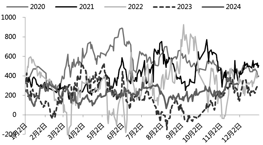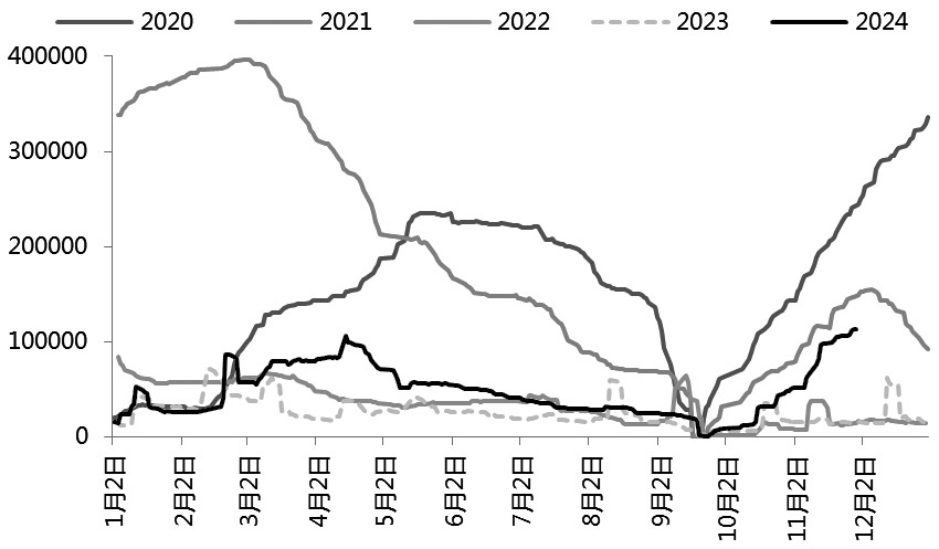 图为PTA加工差走势(单位:元/吨) 值得关注的是,因原料PX持续偏弱,且亚洲PX市场浮动价持续处于大幅贴水状态,PTA实际加工费较好,导致PTA整体开工率维持在八成偏上水平。高供应压力下,PTA基差走弱明显,期现无风险套利下贸易商的入库需求增加,叠加PTA工厂信用仓单增加,使PTA仓单注册量整体增加明显,截至11月29日,PTA注册仓单达113312张,折合PTA吨数约56.656万吨。因此,如果PTA加工费维持目前水平,且PTA工厂可以通过交割来缓解现货出货压力,预计PTA高负荷状态仍可阶段性维持。