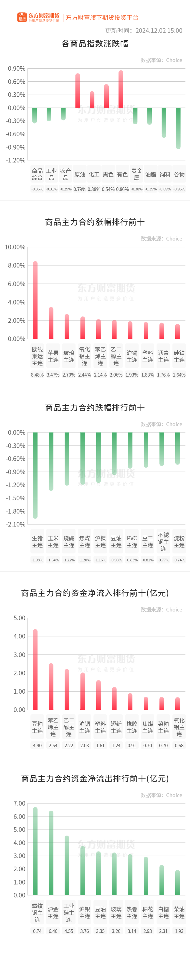 行情纵览![]() 宏观要闻界面新闻:12月2日公布的11月财新中国制造业采购经理指数(PMI)录得51.5,高于10月1.2个百分点,已连续两个月位于扩张区间。 澎湃新闻:12月2日,人民币对美元即期汇率开盘跌破7.24,随后进一步跌破7.25和7.26关口,盘中最低至7.2675,较前一交易日下跌近200点,创下7月25日以来的4个月新低。 品种资讯黑色系期货 钢材:2024年12月1日,沙钢出台2024年12月上旬建材价格政策:1、螺纹:价格不变,现HRB400Ф16-22mm螺纹出厂价格为3700元/吨,Φ10mm加价160元/吨,Φ12mm加价100元/吨,Φ14mm加价30元/吨,Φ22mm加价30元/吨,Φ25mm规格加价30元/吨,Φ28-32mm规格加价60元/吨,Φ36、Φ40mm规格加价250元/吨,抗震钢筋加价30元/吨。2、对11-3期计划量补差50元/吨。3、以上价格均为含税,自2024年12月1日起执行。(西本新干线) 铁矿石:2024年11月25日-12月1日中国47港铁矿石到港总量2468.5万吨,环比减少7.1万吨;中国45港铁矿石到港总量2291.0万吨,环比减少6.2万吨;北方六港铁矿石到港总量1099.5万吨,环比增加71.6万吨。 2024年11月25日-12月1日澳洲巴西铁矿发运总量2534.4万吨,环比减少13.2万吨。澳洲发运量1774.2万吨,环比增加26.2万吨,其中澳洲发往中国的量1373.6万吨,环比减少95.9万吨。巴西发运量760.2万吨,环比减少39.4万吨。本期全球铁矿石发运总量3079.1万吨,环比减少14.5万吨。(Mysteel) 农产品期货 生猪:据国家发改委数据,截至11月27日,全国生猪出场价格为16.94元/公斤,较11月20日上升0.89%;主要批发市场玉米价格为2.20元/公斤,较11月20日下跌2.65%;猪粮比价为7.70,较11月20日上涨3.63%。(发改委网站) 截至12月2日14:00时,全国农产品批发市场猪肉平均价格为23.36元/公斤,比上周五下降0.6%。(农业农村部) 棉花:截止到11月28日,进口棉花主要港口库存周环比增1.7%,总库存50.09万吨。其中,山东地区青岛、济南港口及周边仓库进口棉库存约41.1万吨,周环比增2%,同比库存高33%;江苏地区张家港港口及周边仓库进口棉库存约5.59万吨,其他港口库存约3.4万吨。(Mysteel) 棕榈油:据马来西亚独立检验机构AmSpec,马来西亚11月1-30日棕榈油出口量为1417436吨,较上月同期出口的1581118吨减少10.4%。(新华财经) 有色/贵金属期货 沪铜:截至12月2日周一,全国主流地区铜库存对比上周四增加0.57万吨至14.32万吨,但总库存较去年同期的5.4万吨高8.92万吨,其中上海较上年同期高7.18万吨,广东地区高0.17万吨,江苏地区高1.3万吨。(上海有色网) 沪锌:截至本周一(12月2日),七地锌锭库存总量为9.99万吨,较11月25日降低0.83万吨,较11月28日降低0.43万吨,国内库存录减。(上海有色网) 能化期货 苯乙烯:截至12月2日,江苏苯乙烯港口样本库存总量1.7万吨,较上周期减1.45万吨,降幅46.03%。商品量库存在1万吨,较上周期减1.05万吨,幅度降51.22%。(隆众资讯) 尿素:山东地区尿素行情弱势运行,小颗粒主流出厂成交1740-1790元/吨。临沂市场一手贸易商出货参考价格1800-1810元/吨附近,菏泽市场参考价格1790-1800元/吨附近。(隆众资讯) PVC:杭州PVC市场现货价格弱稳,盘中价格继续看低,电石法五型在5050-5150元/吨,三联5080元/吨,宜化/天湖/中泰/金泰5080-5120元/吨,北元/天业5120-5150元/吨左右,八/三型5220-5300元/吨。(隆众资讯) 其他期货 欧线集运:截至2024年12月2日,上海出口集装箱结算运价指数(欧洲航线)报2828.63点,与上期相比跌1.2%。(上海航运交易所) 晚间关注无 (文章来源:东方财富研究中心) (责任编辑:迷你学人) |