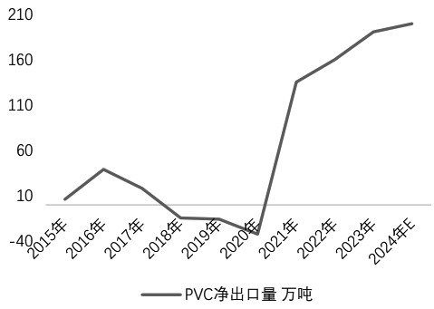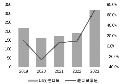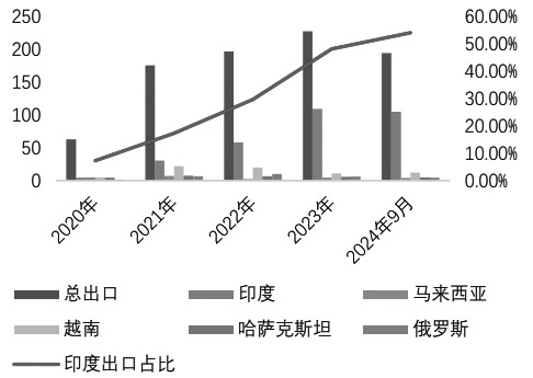 图为我国PVC出口月度数据(单位:万吨) 印度供需缺口利好中国出口 从印度市场来看,截至2023年年末,其国内PVC产能为159.2万吨/年,产量为145万吨/年,而需求量在450万吨/年附近,年进口量超过300万吨,进口依存度近七成。由于自身乙烯供应紧缺、电力供应不足以及氯碱平衡问题难以有效解决,印度PVC产能增速缓慢,2019—2023年,产能仅增长10万吨。未来新增产能方面,至2025年预计印度将维持160万吨/年水平。2026年若审批顺利,阿达尼集团计划投资的200万吨电石法PVC或落地。
