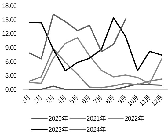 图为我国PVC净出口量(单位:万吨) 我国PVC产能增速近两年有所加快,2023—2024年的年均增速在3.5%以上。从需求侧来看,终端制品主要集中在管型板片材等地产链,而我国的房地产市场在2022年进入需求逐步减弱的周期之中,地产端拖累内需表现。截至目前地产月度数据累计同比均维持负增长,其中销售面积及房屋新开工面积同比降幅均在20%附近。地产行业转弱导致终端企业订单下滑,但出口渠道的打开在一定程度上弥补了地产转弱带来的内需下滑,从企业角度拓宽了销售面,缓解了厂家的库存压力。从价格角度来看,PVC出口价格能对国内不断下跌的PVC价格形成支撑,且在阶段性的集中签单期起到利多刺激作用。 从近十年我国PVC的出口格局来看,2014—2020年,出口未形成明显的倾向性且绝对数量有限;2021年后,我国PVC出口量激增至百万吨水平,并连续3年创历史新高,出口量分别达到175万吨、196万吨和227万吨。2024年,我国PVC出口量或维持220万吨水平,占我国PVC总消费量的10%左右。从今年PVC出口来看,表现依旧较好但节奏上受印度BIS认证政策影响较大。年初数据显示PVC出口表现积极,3月,出口量达到29.7万吨,创下单月出口量历史新高。5—7月,受印度BIS认证政策到期扰动,缩量较明显。在印度BIS认证政策延期后,出口量再度回升至20万吨/月以上水平。从出口量趋势不难看出,政策的影响力度较大。