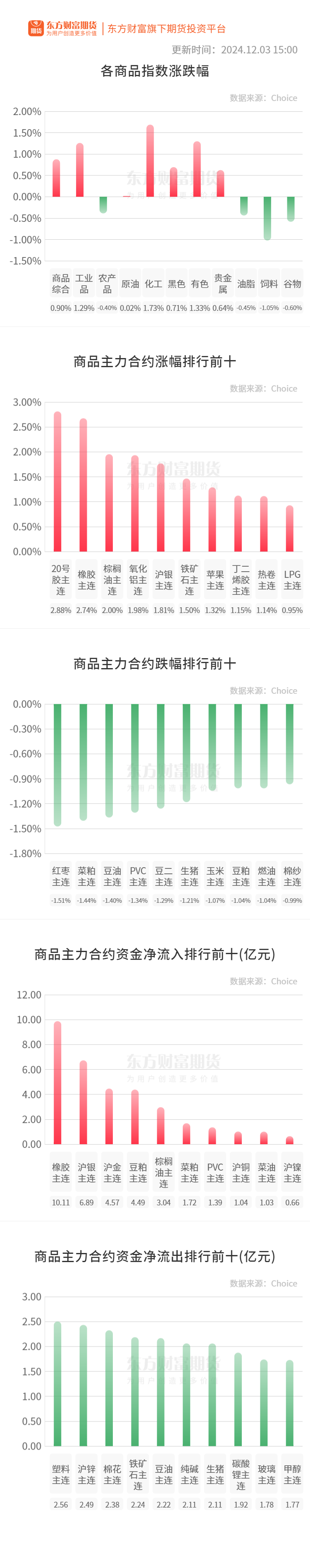 行情纵览![]() 宏观要闻国家发改委:国家发展改革委发布关于完善成品油管道运输价格形成机制的通知。基于成品油管道运输特性,对国家石油天然气管网集团有限公司跨省成品油管道运输价格实行弹性监管机制,由国家发展改革委核定最高准许收入,国家管网集团在不超过最高准许收入的前提下,与用户协商确定跨省管道运输具体价格。 财联社:央行今日进行513亿元7天期逆回购操作,中标利率为1.50%,与此前持平。因今日有2993亿元7天期逆回购到期,实现净回笼2480亿元。 品种资讯黑色系期货 钢材:据不完全统计,截至2024年12月3日,5家钢厂发布2024年冬储政策,其中东北3家,华北1家,西北1家,今日新增西北1家钢厂,月息6‰,点价结算,2025年3月1日停止计息。(Mysteel) 12月3日,长江钢铁对合肥地区建材出厂价调整如下:1、螺纹上调20元:现Φ18mm抗震螺纹价格为3610元/吨;2、盘螺上调20元:现Φ8mm 抗震盘螺价格为3760元/吨;3、线材上调20元:现Φ8mm 抗震盘螺价格为3760元/吨;以上调整均为含税,自2024年12月3日起执行。(西本新干线) 铁矿石:卫星数据显示,2024年11月25日-12月1日期间,澳大利亚、巴西七个主要港口铁矿石库存总量1186.1万吨,环比上升9.1万吨,库存连续两期小幅累库,目前库存绝对量略高于四季度以来的平均值。 12月3日中国47港进口铁矿石库存总量15657.38万吨,较上周一下降139.60万吨。(Mysteel) 农产品期货 生猪:截至12月3日14:00时,全国农产品批发市场猪肉平均价格为23.44元/公斤,比昨天上升0.3%。(农业农村部) 豆粕:监测显示,11月29日,全国主要油厂进口大豆商业库存547万吨,周环比下降15万吨,月环比下降65万吨,同比上升43万吨,较过去三年均值高121万吨。主要油厂豆粕库存85万吨,周环比上升6万吨,月环比下降14万吨,同比上升3万吨,较过去三年均值高29万吨。(国家粮油信息中心) 棉花:12月3日中国棉花价格指数(CCIndex)为15291元/吨,较上个交易日下跌17元/吨。(中国棉花信息网) 有色/贵金属期货 碳酸锂:电池级碳酸锂指数价格78145元/吨,环比上一工作日下跌142元/吨;电池级碳酸锂7.725-7.925万元/吨,均价7.825万元/吨,环比上一工作日下跌150元/吨;工业级碳酸锂7.45-7.55万元/吨,均价7.5万元/吨,环比上一工作日下跌150元/吨。(上海有色网) 沪铝:12月3日广东铝锭库存15.76万吨,较上一交易日减少0.1万吨;无锡铝锭库存16.20万吨,较上一交易日增加0.2万吨;巩义铝锭库存8.90万吨,较上一交易日增加0.39万吨,三地铝锭库存共计增加0.49万吨。(上海有色网) 能化期货 原油:12月3日消息,消息人士透露,“欧佩克+”可能在当地时间5日的会议上将最新一轮石油减产延长至2025年第一季度末,以便为石油市场提供更多支持。“欧佩克+”的石油产量约占全球总量的一半,该组织的目标是在2025年前逐步解除减产。然而,全球需求放缓和该组织以外的产量上升对这一计划构成了障碍,并拖累了油价。(界面新闻) 纸浆:山东地区针叶浆市场主流品牌报价在5850-6300元/吨,主流针叶浆价格较前一工作日持平。今日山东地区纸浆市场震荡整理,市场交投情绪一般,业者报盘较前一工作日持平,实单成交可商议。(隆众资讯) 沥青:截至12月2日当周,国内104家沥青社会库库存共计88.5万吨,环比减少5.2%,其中山东地区社会库去库较为明显。同期国内54家沥青样本厂库库存共计61.7万吨,环比减少4.3%。(隆众资讯) 晚间关注无 (文章来源:东方财富研究中心) (责任编辑:迷你学人) |