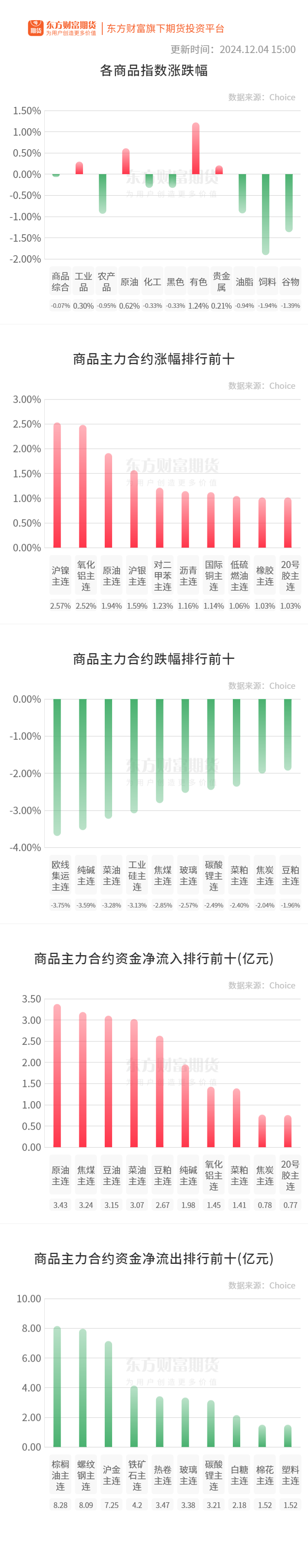 行情纵览![]() 宏观要闻央视财经:记者今天从国家发展改革委了解到,12月4日24时新一轮成品油调价窗口开启。据国家发展改革委价格监测中心监测,本轮成品油调价周期内(11月20日—12月3日),国际油价小幅波动。按现行国内成品油价格机制测算,调价金额每吨不足50元,本次汽、柴油价格不作调整,未调金额纳入下次调价时累加或冲抵。 财联社:央行今日开展413亿元7天期逆回购操作,因今日有2683亿元7天期逆回购到期,实现净回笼2270亿元。 品种资讯黑色系期货 钢材:12月4日,长江钢铁对合肥地区建材出厂价调整如下:1、螺纹上调10元:现Φ18mm抗震螺纹价格为3620元/吨;2、盘螺上调20元:现Φ8mm 抗震盘螺价格为3780元/吨;3、线材上调20元:现Φ8mm 抗震盘螺价格为3780元/吨;以上调整均为含税,自2024年12月4日起执行。(西本新干线) 11月下旬,21个城市5大品种钢材社会库存683万吨,环比减少1万吨,下降0.1%,库存变化不大;比10月下旬减少17万吨,下降2.4%;比年初减少46万吨,下降6.3%;比上年同期减少72万吨,下降9.5%。其中,螺纹钢库存278万吨,环比增加11万吨,上升4.1%,库存连续上升;比10月下旬增加36万吨,上升14.9%,比年初减少27万吨,下降8.9%;比上年同期减少15万吨,下降5.1%。(中钢协) 铁矿石:记者12月4日从淡水河谷获悉,公司已开始试运行卡帕内玛最大化项目,该项目旨在将巴西米纳斯吉拉斯州马里亚纳综合运营区的铁矿石年产能增加1500万吨。(上海证券报) 农产品期货 生猪:国家统计局数据显示, 据对全国流通领域9大类50种重要生产资料市场价格的监测显示,2024年11月下旬与11月中旬相比,20种产品价格上涨,30种下降。其中,生猪(外三元)价格16.5元/千克,较上期价格环比涨1.2%。(财联社) 截至12月4日14:00时,全国农产品批发市场猪肉平均价格为23.52元/公斤,比昨天上升0.3%。(农业农村部) 棉花:国际棉花咨询委员会(ICAC)发布的数据显示,全球2024/2025年度棉花期末库存预估为1847.03万吨,上月预估为1846.10万吨,2023/2024年度期末库存预估为1856.27万吨,同比减少0.5%。全球2024/2025年度棉花产量预估为2529.90万吨,上月预估为2525.99万吨,2023/2024年度产量预估为2412.30万吨,同比增加4.9%。(新华财经) 油脂:10月份以来,我国植物油进口减少,三大植物油库存下降。监测显示,截至11月29日,国内三大油脂库存总量196万吨,周环比下降4万吨,月环比下降4万吨,同比下降21万吨。(新华财经) 有色/贵金属期货 碳酸锂:上海钢联发布数据显示,今日电池级碳酸锂(早盘)价格较上日下跌500元,均价报77250元/吨。(财联社) 工业硅:据中国贸易救济信息网,11月29日,美国商务部发布公告,对进口自柬埔寨、马来西亚、泰国和越南的晶体硅光伏电池(无论是否组装成模块)作出反倾销初裁。(界面新闻) 沪铝:截至本周一(12月2日),国内电解铝锭社会库存54.6万吨,较上周四减少0.7万吨,其中无锡地区去库明显,较上周四减少1.0万吨至16.6万吨附近。(上海有色网) 能化期货 沥青:截至12月4日当周,中国沥青炼厂产能利用率为28.9%,环比下降3.6%,沥青周产量为51.9万吨,环比下降9.4%。齐鲁石化以及江苏新海推迟生产,加之西北、华北以及华东地区个别炼厂小幅降产,带动产能利用率下降。(隆众资讯) 甲醇:常州地区甲醇主流商家价格参考2515-2520元/吨附近,基差参考-25元/吨附近;张家港地区价格参考2525-2530元/吨附近,基差参考-15元/吨附近;靖江地区价格参考2520元/吨。 截至2024年12月4日,中国甲醇港口库存总量在122.13万吨,较上一期数据增加4.43万吨。其中,华东地区累库,库存增加5.8万吨;华南地区去库,库存减少1.37万吨。(隆众资讯) 尿素:12月4日尿素行情稳中整理,个别地区小幅下调10元/吨左右。(农时达情报) 山东地区尿素行情稳中偏弱,小颗粒主流出厂成交1750-1790元/吨。临沂市场一手贸易商出货参考价格1790-1800元/吨附近,菏泽市场参考价格1780-1790元/吨附近。(隆众资讯) 晚间关注无 (文章来源:东方财富研究中心) (责任编辑:迷你学人) |