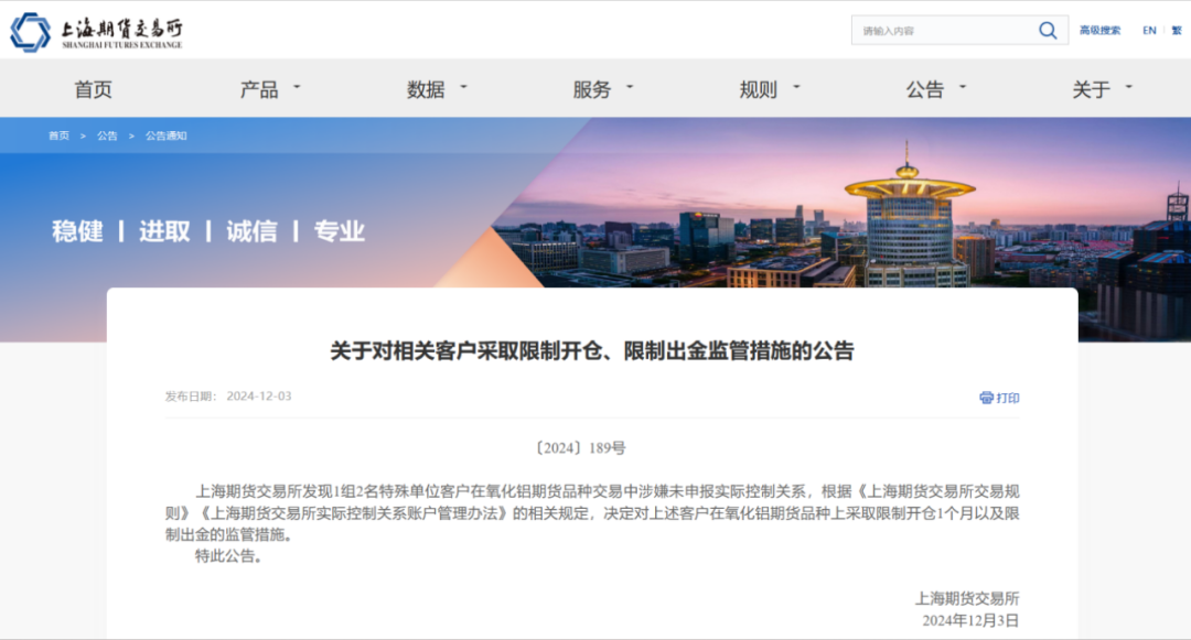 12月3日,上海期货交易所(下称上期所)发布公告,对在氧化铝期货品种交易中涉嫌未申报实际控制关系的1组2名特殊单位客户,采取限制开仓1个月以及限制出金的监管措施。 ![]() 券商中国记者发现,上期所持续加强对于各类违规交易行为的打击力度,氧化铝期货市场成为近期监管重点,已有多名个人客户和特殊单位客户因违规参与氧化铝期货被处罚。 上期所连发监管公告 据统计,仅今年11月以来,上期所已发布9条监管措施公告,2条违规处理决定公告。 在上述9条监管措施公告中,有6条涉及氧化铝期货市场违规交易,占比超过六成。券商中国记者发现,这些在氧化铝期货市场的违规处罚,问题均是“涉嫌未申报实际控制关系”,被采取的监管措施都是“采取限制开仓1个月以及限制出金”。