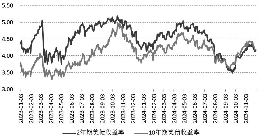 图为2年期和10年期美债收益率 综上所述,特朗普上任后将面临重大的财政挑战,美国庞大且不断增长的国家债务有可能减缓经济增长、提高利率和支付、削弱国家安全、限制政策选择并增加最终发生财政危机的风险。在高利率和高债务的背景下,美国财政扩张的不可持续性和关税对经济活动抑制作用的滞后性,或使美国经济增长在2025年很难高于2024年,这意味着美元高利率不可持续,但通胀的顽固性支撑美债收益率中短期维持高位。投资者可以运用芝商所的收益率期货(Yield Futures)来对冲利率波动风险,并通过芝商所FedWatch工具观察美联储12月议息会议降息的可能性,提前做好利率下行的风险对冲部署。(作者单位:广州金控期货) (责任编辑:迷你学人) |