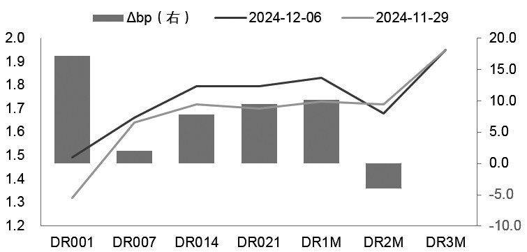 11月初,在国内外宏观不确定性落地之后,债市出现一波试探性的上涨行情。比如10年期活跃券240011,从11月6日到11月12日利率下行接近5个基点,向下突破2.1%关口,至2.07%附近。随后由于2万亿元置换专项债政策迅速落地,出于对供给扰动的担忧,利率回升至2.11%。这是第一轮试探。之后,随着专项债供给的不断加码,市场发现一级市场承接情况良好,发行利率基本为同期国债收益率上浮5~7个基点的水平。在确认供给扰动无虞后,债市开启了第二轮试探性上涨行情。 笔者认为,流动性是本轮债市上行的主要推动力量,也于债券供给压力的减弱,央行在公开市场的支持有关。根据央行公告,11月继续实现国债净买入2000亿元,自8月份净买入1000亿后,每月净买入均为2000亿元,4个月共计净买入7000亿元。此外,还以固定数量、利率招标、多重价位中标方式开展8000亿元买断式逆回购。买断式逆回购从2024年10月启动,10月份共开展5000亿元6个月期的买断式逆回购,而11月则是开展了8000亿元买断式逆回购,期限缩短至3个月,这应该是买断式逆回购的最短期限。买断式逆回购在引导中期资金价格的同时,也会承担部分替代MLF的作用。10月MLF到期7890亿元,缩量续作7000亿元,加上买断式逆回购5000亿元,净投放4110亿元。11月MLF到期1.45万亿元,缩量续作9000亿元,加上买断式逆回购8000亿元,净投放2500亿元。 央行通过公开市场不断投放基础货币,资金利率中枢也明显回落,且央行12月降准的概率较大,所以笔者认为,流动性是本轮债市上行的主要推手。 但利率快速下行至1.95%附近后,市场环境发生了一些边际变化。 上周一,在几乎没有遇到任何阻力的情况下,10年期国债收益率历史性下破2%关口。上周三,现券利率进一步回落至1.95%附近开始震荡。伴随着利率的进一步下行,笔者认为债券市场环境已经从乐观渐渐转向中性,从坚定的多头行情逐渐变成了日内偏强的无序波动。因此,短期市场投资者对风险的担忧要胜过对投资机会的关注。