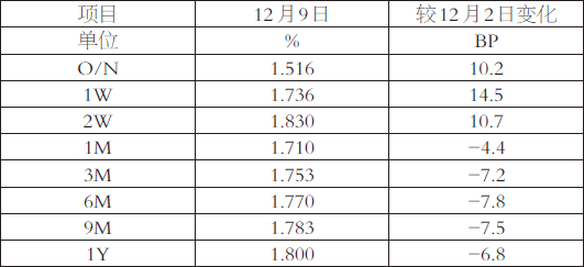 本周国内市场利率呈现“短强长弱”的态势。一方面,临近月中和年底,月中缴税、缴款压力增加,年底资金需求上升,使得短期利率开始走强;另一方面,国内资金供大于求格局未变,中长期利率延续弱势。12月9日,隔夜、1周、2周期Shibor分别报收于1.516%、1.736%、1.830%,较12月2日分别上升10.2、14.5、10.7个百分点;1个月、3个月、6个月、9个月、1年期Shibor分别报收于1.710%、1.753%、1.770%、1.783%、1.800%,较12月2日分别下跌4.4、7.2、7.8、7.5、6.8个百分点。