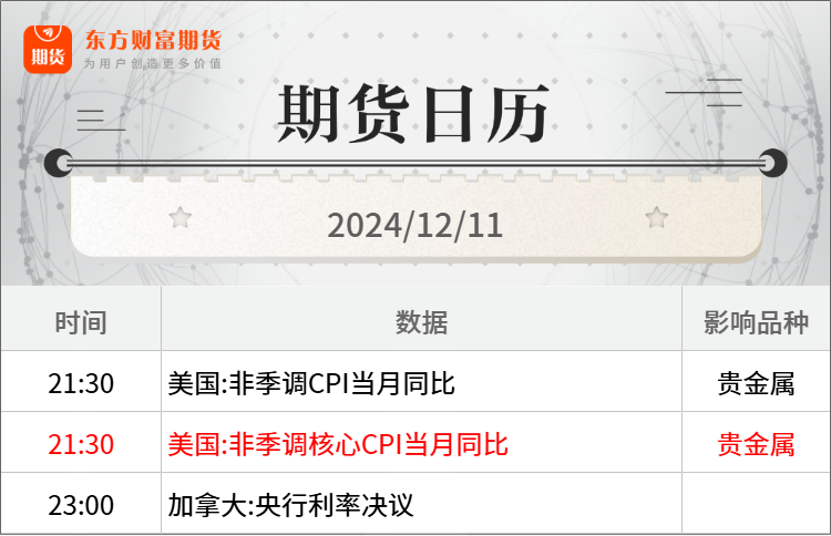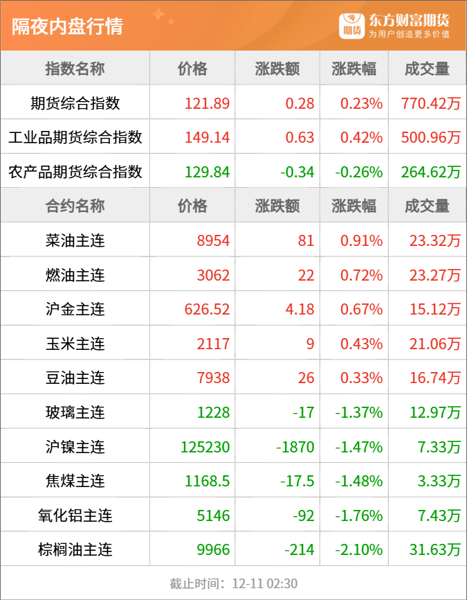 隔夜行情![]() ![]() 每日精选农业农村部发布最新一期农产品供需形势分析 调减2024/25年度玉米产量预测值 钢企“外向”趋势明显 钢材出口量破亿吨创八年新高 叙利亚政权更迭后中东局势再掀波澜 国际油价影响几何 宏观产经新华社:国家主席习近平在北京人民大会堂会见来华出席“1+10”对话会的主要国际经济组织负责人。习近平指出,经历40多年持续快速发展,中国经济已经步入高质量发展阶段,对世界经济增长贡献率保持在30%左右。中方有充分信心实现今年经济增长目标,继续发挥世界经济增长最大引擎作用。 新华社:9日召开的中共中央政治局会议,分析研究2025年经济工作,其中货币政策的表述引人关注。时隔10多年,货币政策取向再次改为“适度宽松”体现了支持性货币政策立场,传递出积极信号,将有力提振各方信心,助力中国经济回升向好。 海关总署:今年前11个月,我国货物贸易进出口总值39.79万亿元,同比增长4.9%,实现平稳增长。其中,出口23.04万亿元,同比增长6.7%;进口16.75万亿元,同比增长2.4%。 品种资讯 黑色系期货 螺纹钢:海关总署12月10日数据显示,2024年11月中国出口钢材927.8万吨,较上月减少190.4万吨,环比下降17.0%;1-11月累计出口钢材10115.2万吨,同比增长22.6%。(财联社) 铁矿石:据上海钢联(Mysteel)统计,12月10日,全国主港铁矿累计成交84.5万吨,环比下跌34.74%;本月平均每日成交101.5万吨,环比下跌10.81%。当天远期现货累计成交105万吨(8笔),环比上涨41.89%,其中矿山成交量为51万吨。(Mysteel) 12月10日中国47港进口铁矿石库存总量15746.53万吨,较上周一增加89.15万吨。具体区域来看,本期库存增量主要体现在华南和沿江两个区域,卸货入库量增加致使港库增量相对明显;北方三个区域港库较上周一均呈现小幅去库态势。(Mysteel) 硅铁:据上海钢联(Mysteel),河钢12月硅铁招标询盘6400元/吨,11月定价6550元/吨,较上轮降150元/吨。12月河钢75B硅铁招标数量2141吨,上轮招标数量1500吨,较上轮增加641吨。(Mysteel) 农产品期货 大豆:海关总署显示,中国1-11月大豆进口为9709万吨。其中,中国11月大豆进口715.4万吨,10月为808.7万吨。(新华财经) 鸡蛋:上海钢联数据显示,上周鸡蛋主产区均价4.52元/斤,较前一周上涨0.21元/斤,涨幅4.87%,主销区均价4.55元/斤,较前一周上涨0.23元/斤,涨幅5.32%。(e公司) 菜油:中国粮油商务网监测数据显示,截止到2024年第49周末,国内进口压榨菜油库存量为49.9万吨,较前一周增加0.4万吨,环比增幅0.75%;合同量为23.9万吨,较前一周减少1.1万吨,环比降幅4.37%。(新华财经) 棕榈油:中国粮油商务网监测数据显示,截止到2024年第49周末,国内棕榈油库存总量为48.1万吨,较上周的45.7万吨增加2.4万吨;合同量为2.4万吨,较上周的5.3万吨减少2.9万吨。(新华财经) 有色/贵金属期货 沪铜:德国商业银行预测到2025年底,铜价将上涨至每吨9700美元。(财联社) 沪铝:海关总署显示,中国11月未锻轧铝及铝材出口66.9万吨,10月为57.7万吨。(新华财经) 碳酸锂:上海钢联12月10日发布的最新数据显示,电池级碳酸锂等锂电材料报价较12月9日略有下跌。其中,电池级碳酸锂均价报76450元/吨,较12月9日下跌450元;工业级碳酸锂均价报73000元/吨,较12月9日下跌900元;电池级氢氧化锂(粗颗粒)均价报69000元/吨,报价与昨日持平。(中国证券网) 能化期货 原油:尽管地缘局势推动油价短暂回升,但需求疲软限制了油价进一步上涨的空间。Tomomichi Akuta指出,沙特阿美下调油价和OPEC+上周延长减产协议,表明市场可能在年底前继续走软,且投资者正在关注特朗普当选美国总统后的能源政策及其对中东政策的变化可能给市场带来的影响。(第一财经) 伊拉克国家石油营销组织SOMO表示,伊拉克将明年1月销往亚洲的巴士拉中质原油官方售价定为较阿曼/迪拜均价贴水0.6美元/桶。(财联社) 沥青:最新数据显示,截至12月9日当周,山东独立炼厂原油到港量为106.5万吨,环比下跌103.2万吨,跌幅为49.21%。本期到港原油以中质原油为主,其中俄罗斯原油到港29.7万吨,且有1船新的稀释沥青到港。相较之下,去年同期,山东独立炼厂原油到港量为137.5万吨,环比下跌24万,跌幅为14.86%,到港原油以中质原油为主,其中俄罗斯原油到港40万吨,且有1船稀释沥青新到港。(隆众资讯) 原木:进入12月,工地需求整体偏弱,但在四季度“抢出口”和古建、家装需求的带动下,原木消费呈现“外需强、内需弱”格局,即建筑工地口料材和包装/古建/无节材需求分化,上周港口日均出库量继续下滑,不过原木到港量也不高,截止12月9日,中国7省针叶原木码头和堆场库存总量260.38立方米,较上周下降1.1%,其中仅山东港库存增加。(隆众资讯) 环球视野央视新闻:当地时间12月10日,穆罕默德·巴希尔在电视声明中表示,他已被任命为叙利亚过渡政府看守总理,任期至2025年3月1日。 新华网:马来亚投资银行10日发布报告显示,尽管面临美国经济政策转向、全球贸易紧张持续加剧、通胀压力仍存等风险性因素,2025年东盟国家经济仍具有增长韧性与潜力。 每日关注![]() (文章来源:东方财富研究中心) (责任编辑:迷你学人) |