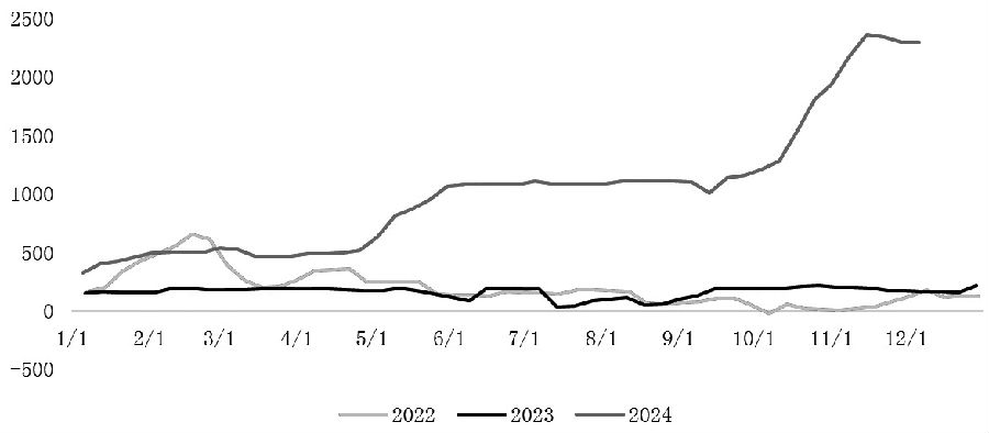 图为山东32%烧碱及氧化铝采购价(单位:元/吨) 从氧化铝看,当前核心点在于高利润刺激企业开工意愿。截至12月6日当周,氧化铝利润小幅回落,但仍维持在2300元/吨以上,远超2022—2023年200~300元/吨的平均生产利润。但中期来看,供应端难有进一步提振的空间,主要制约在于,在国内铝土矿复产缓慢下原料供应存在掣肘。此外,进口矿的补充也将使得生产过程中单位耗碱量出现下降。氧化铝有支撑,但难有更多驱动。 当前烧碱盘面远月定价已有所回落,但现货价格坚挺,基差持续高位运行。当前现货支撑在于需求表现尚可,山东区域液碱库存同比偏低。当期供应和库存变化印证了这一观点:截至12月6日当周,山东区域样本周度加权开工率在90.47%,同比处于近五年的绝对高位水平。而在持续九成以上高产现状下,山东区域样本32%液碱厂库累积至2.81万吨,环比增加0.6万吨。自山东开工提至九成附近,盘面价格向上阻力明显增大。需求侧伴随氧化铝难有进一步提负空间及氧化铝厂碱需求紧张逐步缓解,山东供需格局边际已转弱。 氧化铝利润大涨刺激了行业的生产意愿,进而提振了原料烧碱的需求。此外,利润的扩张也同样扩大了对原材料成本的“宽容度”。采购价格不断上提带动碱价上涨,而由于烧碱成本主要为原盐和电力,调整频率及幅度均有限,烧碱利润扩张迅速。从山东氯碱综合利润看,当前利润在1200元/吨附近,较9月450~480元/吨的重心有翻倍的涨幅,同比看也高于2023年当期水平。受利润扩张刺激,烧碱行业开工对应进入高产阶段,而烧碱的价格则受到阶段性的供需边际变化和预期的影响。因此,烧碱期货2501合约已兑现山东供需转弱的现实,后续主要面对临近交割前高基差最终方向选择的问题。