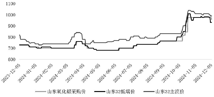 图为氧化铝企业产量占比(单位:%) 以烧碱核心产销区域山东视角看,由于魏桥和信发在山东体量规模大且集中,对山东区域的烧碱需求影响大。烧碱企业由于低浓度液碱运输半径受限,导致直供省内下游通常为经济性较高的优选项,进一步强化了氧化铝在需求侧的议价能力。 从行情来看,自10月以来,烧碱迎来一轮上涨。从基本面看,10月山东进入秋检阶段,产量有所下降。受送货减量影响,魏桥氧化铝厂烧碱库存走低刺激采购意愿,山东某氧化铝新投装置备碱,为提高送货量,氧化铝厂上提液碱采购价格。此外,某氧化铝厂因自备氯碱装置检修,为维系生产,在市场“扫货”以供给其山东、山西的氧化铝厂。氧化铝厂以保生产为首要目标下竞相提价抢货,10—11月山东氧化铝厂连续4次上调32%液碱采购价格,推高烧碱价格。