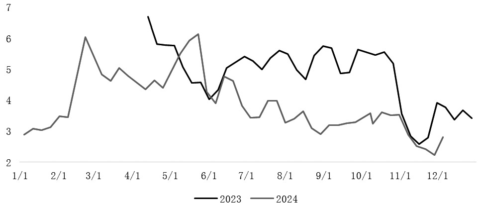 图为山东32%液碱厂库库存(单位:万吨) 烧碱现货价格开始松动,但仍需关注氧化铝厂的烧碱采买价能否向下共振或是维持高位支撑。中期看,氧化铝在明年上半年有大量投产,届时将支撑区域烧碱需求量;但同时需关注进口矿替代后氧化铝对烧碱单耗下降的影响,以及氧化铝价格下跌后产业链利润“回收”对烧碱估值重心的影响。预计氧化铝期货2505合约仍是影响烧碱定价中枢的重要因素。(作者单位:广发期货) (责任编辑:迷你学人) |