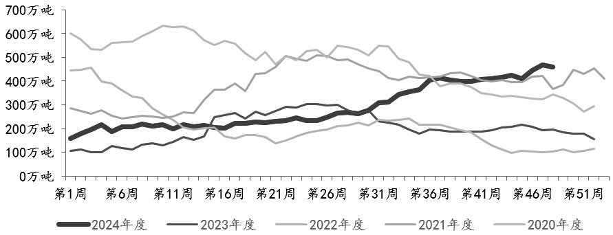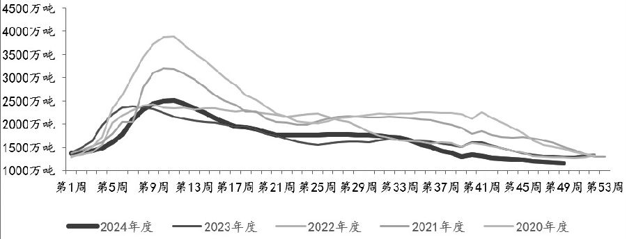 图为五大港口炼焦煤库存走势 钢材低库存使得减产缓慢,关注累库拐点。螺纹钢钢厂库存及社会库存均处于近五年的低位,热轧卷板库存也处于偏低位置。截至12月6日,螺纹钢库存为442.56万吨,同比下降16.63%;热轧卷板库存为305.62万吨,同比下降6.57%。在宏观预期提振及双焦价格连续下跌中,钢厂利润明显好转,且库存结构相对稳健。截至12月10日,7家钢厂发布2024年螺纹钢冬储政策,价格区间在3200~3500元/吨。下游贸易企业多维持低库存策略,在产业供需格局偏弱背景下,冬储很难超预期,对相关品种价格的支撑力度也有限。 国内制造业需求和出口暂时平稳,为市场提供一定支撑。11月,国内制造业采购经理指数(PMI)为50.3%,比上月上升0.2个百分点,制造业扩张步伐小幅加快。钢材直接出口仍处于高位,11月中国出口钢材927.8万吨,环比下降17.0%;1—11月累计出口钢材10115.2万吨,同比增长22.6%。长期看,中美贸易摩擦对钢价的影响可能在明年一季度,韩国、越南的反倾销制裁落地可能在明年下半年,预计钢材需求难有增量。 展望后市,12月上旬市场交易重心在于房地产和基建政策预期,黑色板块受此提振有望走强,炉料分化走势预计维持。在市场预期结束后,交易重心将回归基本面。目前炉料供应宽松压制期价上方空间,钢厂利润好转且减产进度偏慢,供需可能出现矛盾,关注钢材累库拐点。整体看,12月钢价将先扬后抑,上下空间皆有限。(作者单位:国元期货) (责任编辑:迷你学人) |