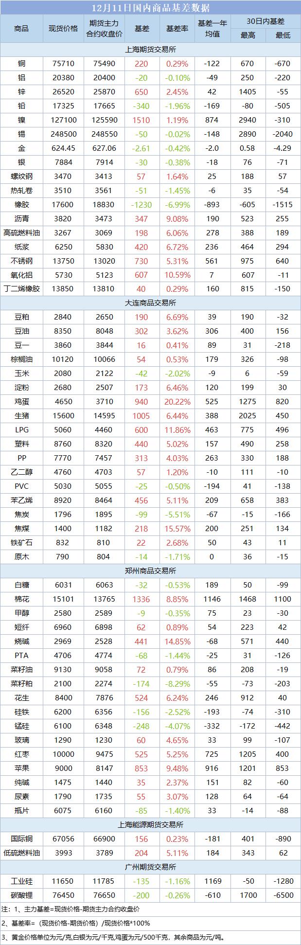 基差报告:12月11日国内商品基差数据一览