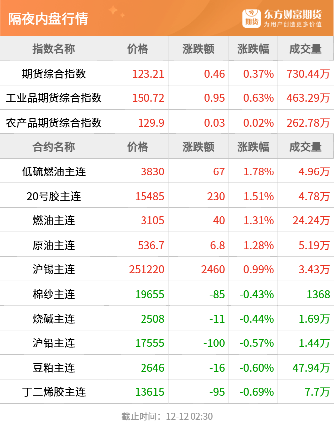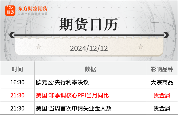 隔夜行情![]() ![]() 每日精选中储粮玉米收储增规模、稳市场 美国11月CPI同比增长2.7% 符合市场预期 猪企销量“冲刺”:7成以上出栏目标完成进度超90% 宏观产经中国网信网:今年以来,国家网信办对网上金融信息乱象保持高压严打态势,清理金融领域引流类及诱导性违规信息,加大对无资质从事金融相关业务的网站及账号的处置处罚力度。下一步,国家网信部门将继续加强对网上金融信息乱象的打击整治力度,规范网上金融信息传播秩序,着力维护人民群众财产安全。 21财经:据悉,本周将公布个人养老金扩容政策,纳入个人养老金可投产品可能包括跟踪沪深300指数、中证500指数、中证800指数、创业板指数、科创50指数等近20只宽基指数的场外产品。 中汽协:11月,汽车产销分别完成343.7万辆和331.6万辆,环比分别增长14.7%和8.6%,同比分别增长11.1%和11.7%。1-11月,汽车产销分别完成2790.3万辆和2794万辆,同比分别增长2.9%和3.7%,汽车产量增速较1-10月扩大1.1个百分点,销量增速扩大1个百分点。 品种资讯黑色系期货 钢材:调研结果显示:本周唐山主流样本钢厂平均铁水不含税成本为2364元/吨,平均钢坯含税成本3140元/吨,周环比下调15元/吨,与12月11日当前普方坯出厂价格3130元/吨相比,钢厂平均亏损10元/吨,周环比减少25元/吨。(Mysteel) 铁矿石:据上海钢联(Mysteel)统计,12月11日,全国主港铁矿累计成交97.3万吨,环比上涨15.11%;本月平均每日成交100.9万吨,环比下跌11.34%。当天远期现货累计成交88.6万吨(6笔),环比下跌15.62%,其中矿山成交量为70.8万吨。(Mysteel) 花旗将铁矿价格预测从每吨110美元下调至每吨100美元。(财联社) 焦炭:近期,焦炭价格第四轮提降全面落地,记者了解到,唐山、邢台、天津、石家庄市场主流钢厂计划对湿熄焦炭价格下调50元/吨、干熄焦下调55元/吨,2024年12月9日零时起执行。除了华北,华东等地区的主流钢厂也对焦炭采购价格进行了下调,目前累计下降200—220元/吨。(华夏时报) 农产品期货 淀粉:近期受到局部环保政策与设备检修的影响,个别玉米淀粉企业开机小幅下滑,行业整体开机高位略降。调查数据显示,本周(12月5日-12月11日)全国玉米加工总量为69.19万吨,较上周减少1.05万吨;周度全国玉米淀粉产量为35.8万吨,较上周产量减少0.74万吨;周度开机率为69.21%,较上周降低1.43%。(Mysteel) 棕榈油:南部半岛棕榈油压榨商协会(SPPOMA)数据显示,2024年12月1-10日马来西亚棕榈油单产减少12.89%,出油率减少0.57%,产量减少15.89%。(新华财经) 豆粕:据上海钢联(Mysteel)农产品团队统计,12月11日全国主要油厂豆粕成交14.78万吨,较前一交易日减少12.69万吨,其中现货成交7.58万吨,远月基差成交7.2万吨。当日全国动态全样本油厂开机率上升至51.48%。(Mysteel) 大豆:美国农业部数据显示,12月美国2024/2025年度大豆产量预期为44.61亿蒲式耳,11月预期为44.61亿蒲式耳。12月美国2024/2025年度大豆期末库存预期为4.7亿蒲式耳,市场预期为4.69亿蒲式耳,11月预期为4.7亿蒲式耳。12月美国2024/2025年度大豆单产预期为51.7蒲式耳/英亩,11月预期为51.7蒲式耳/英亩。(财联社) 有色/贵金属期货 沪锌:安泰科报告称,统计结果显示,2024年1-11月样本企业锌及锌合金产量为520.6万吨,同比下降3.2%。11月份单月产量为47万吨,同比下降8.4%,环比下降1300吨,日均产量环比增加3.1%。预估12月份精锌产量环比增加2700吨。(新华财经) 碳酸锂:电池级碳酸锂指数价格76441元/吨,环比上一工作日下跌103元/吨;电池级碳酸锂7.52-7.79万元/吨,均价7.655万元/吨,环比上一工作日下跌100元/吨;工业级碳酸锂7.28-7.38万元/吨,均价7.33万元/吨,环比上一工作日下跌100元/吨。(上海有色网) 氧化铝:12月10日,海外成交氧化铝3万吨,成交价格 $680/mt FOB Western Australia西澳,1月下旬/2月上旬船期。(SMM) 贵金属:花旗称黄金和白银将在未来3-12个月恢复逐步上涨趋势,料分别达到每盎司3,000美元及36美元。(财联社) 能化期货 原油:欧佩克对2024年世界石油需求预测做出迄今最大幅度的下调。根据其月度报告,石油输出国组织将2024年的消费增长预测下调了21万桶/天,至160万桶/日;将2025年全球原油需求增速预期从154万桶/日下调至145万桶/日;为连续第五个月下调今明两年全球原油需求增速预期。(财联社) 欧佩克最新月报称,11月份欧佩克原油日产量平均为2666万桶,比10月份增加10.4万桶,利比亚产量增幅贡献最大。(新华财经) 沥青:最新数据显示,截至12月11日当周,中国沥青炼厂产能利用率为29.7%,环比增加0.8%,沥青周产量为52.4万吨,环比增加1.0%。周内辽宁华路、齐鲁石化、山东胜星复产沥青,带动产能利用率增加。综合来看,全国范围内华南地区产能利用率最高,东北地区产能利用率垫底。华南地区产能利用率为44.4%,环比上涨3.5%,东北地区产能利用率为16.4%,环比增加1.7%。(隆众资讯) 甲醇:截至2024年12月11日,中国甲醇港口库存总量在108.50万吨,较上一期数据减少13.63万吨。其中,华东地区去库,库存减少10.85万吨;华南地区去库,库存减少2.78万吨。(隆众资讯) 环球视野财联社:美国11月CPI同比增长2.7%,预估为增长2.7%,前值为增长2.6%;11月CPI环比增长0.3%,预估为增长0.3%,前值为增长0.2%。 财联社:美国抵押贷款利率上周再次下降,虽然下降幅度不大,但足以刺激现有房主寻求一些储蓄。美国抵押贷款银行协会(MBA)的季节性调整指数显示,抵押贷款总需求增加了5.4%,这背后是再融资的激增。住房贷款再融资申请较前