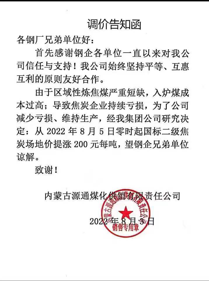 内蒙古源通:决定自8月5日零时起对焦炭价格调涨200元/吨 西本新干线 08月03日 内蒙古源通发布调价公告,考虑企业持续亏损,决定自8月5日零时起对焦炭价格调涨200元/吨,具体通知如下:(文章来源:西本新干线) (责任编辑:admin)