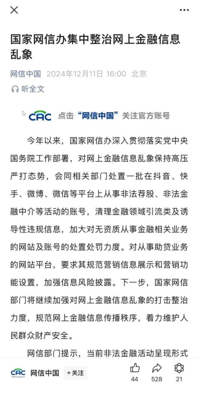 12月11日,据“网信中国”公众号,国家网信办正集中整治网上金融信息乱象。 据悉,今年以来,国家网信办深入贯彻落实党中央国务院工作部署,对网上金融信息乱象保持高压严打态势,会同相关部门处置一批在抖音、快手、微博、微信等平台上从事非法荐股、非法金融中介等活动的账号,清理金融领域引流类及诱导性违规信息,加大对无资质从事金融相关业务的网站及账号的处置处罚力度。 下一步,国家网信部门将继续加强对网上金融信息乱象的打击整治力度,规范网上金融信息传播秩序,着力维护人民群众财产安全。 券商中国记者注意到,近期,包括抖音、微信等平台相继加大平台金融类违规账号整治力度,不少机构也相继被罚。 ![]() 国家网信办集中整治网上金融信息乱象 12月11日,“网信中国”公众号发布《国家网信办集中整治网上金融信息乱象》称,今年以来,国家网信办深入贯彻落实党中央国务院工作部署,对网上金融信息乱象保持高压严打态势,会同相关部门处置一批在抖音、快手、微博、微信等平台上从事非法荐股、非法金融中介等活动的账号,清理金融领域引流类及诱导性违规信息,加大对无资质从事金融相关业务的网站及账号的处置处罚力度。对从事助贷业务的网站平台,要求其规范营销信息展示和营销功能设置,加强信息风险披露。下一步,国家网信部门将继续加强对网上金融信息乱象的打击整治力度,规范网上金融信息传播秩序,着力维护人民群众财产安全。 网信部门提示,当前非法金融活动呈现形式多样、隐蔽性强的特点,有的打着“拼单团购”“社交电商”“消费返利”“网络兼职”“虚拟养殖”“电子币交易”等旗号开展网络传销活动,有的以“债务重组”“债务优化”为名收取“砍头息”加重债务人负担,有的以“零门槛”“零利息”“到账快”等话术诱导盲目借贷。特别是随着近期资本市场交易活跃度提升,一些账号以“分享炒股技巧”“大佬看盘”“高手指导”为噱头,通过直播、短视频、图文等形式从事非法荐股活动并骗取高额费用,对投资者特别是中小投资者造成财产损失。 对此,提醒广大网民树立正确投资理念,增强风险意识,切勿轻信“赚快钱”“一夜暴富”“动动手指就赚钱”“锁定牛股”等渲染高收益、高回报的相关信息,注意辨别验证相关网站平台及账号资质,不参与非法金融活动,谨防个人财产损失。 平台持续规范整治 今年四季度以来,随着股市热度增加,在抖音、视频号、小红书、B站、快手等各大社交平台关于A股的视频、文章大量涌现,违规荐股、晒股等乱象层出不穷,更有一些“投顾概念股”股价表现出异动。 面对新涌现的网上违规荐股乱象,监管部门联合平台进行集中整治、规范。包括抖音、微信视频号等平台均相继发布公告,清理平台上违规账号,不少大V也在清理之列。 10月11日,“抖音安全中心”微信公众号发布《抖音关于打击“非法荐股”等非法证券活动的处罚公告》。其中指出,最近一个月,抖音累计治理股市相关违规账号3600余个、违规内容15000余条。平台已针对发现的违规内容和账号,采取了包含内容下架、资料重置、账号禁言在内的手段进行处置。 11月15日,微信视频创作安全中心发布《微信视频号直播违规打击公告(2024年10月)》。据悉,2024年10月,平台累计处置23574个违规直播间,11590个违规账号。其中,不少账号的违规类型为违规推荐股票、出镜主播与执业编号人员身份核验不一致等不规范直播特定资质内容。 视频号官方还提醒,主播在未完成金融科普资质的准入情况下,请不要在直播间内分享金融相关内容。已完成金融科普资质准入的主播,直播时应遵守相应的规范,切勿在金融科普类直播间中,出现违规推荐股票、违规引流、出镜主播与执业编号人员身份核验不一致等不规范行为。