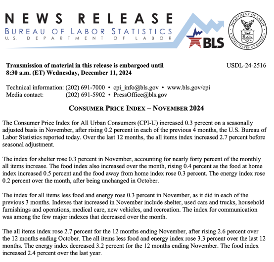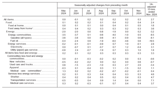 美联储12月降息稳了? 当地时间12月11日,美国11月消费者价格指数(CPI)数据揭晓,同比增长2.7%,环比增长0.3%,均符合预期。 在数据发布后,交易员们增加了对美联储12月份降息的押注。芝商所FedWatch工具显示,美联储12月降息概率大幅升至97.9%,一日前该概率为88.9%。 金融市场方面,数据发布时美股还未开盘,但三大股指期货均出现短线拉升。随后,美股三大指数均高开,纳指和标普500指数持续扩大涨幅。截至发稿,道指涨0.11%,纳指涨1.15%,标普500指数涨0.65%。 ![]() 美国11月CPI同比增长2.7% 当地时间12月11日,美国劳工统计局发布的数据显示,11月CPI同比上涨2.7%,与市场预期一致,略高于10月的2.6%。环比方面,11月CPI上涨0.3%,同样符合市场预期。剔除波动较大的食品和能源价格后,核心CPI同比上涨3.3%,环比上涨0.3%,均与10月持平。 ![]() (来源:美国劳工统计局) 数据显示,住房价格是11月CPI环比上涨的主要推手,贡献了接近40%的涨幅。此外,食品价格环比上涨0.4%,其中家庭食品价格上涨0.5%,餐饮外食品价格上涨0.3%。 ![]() (来源:美国劳工统计局) 能源价格环比上涨0.2%,结束了10月的持平状态。其中,汽油价格上涨0.6%,天然气价格上涨1.0%,但电力价格下降0.4%。能源价格同比下降3.2%,主要受汽油价格同比大跌8.1%以及燃油价格下降19.5%的影响。