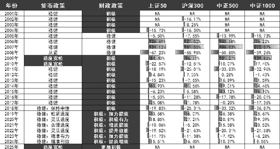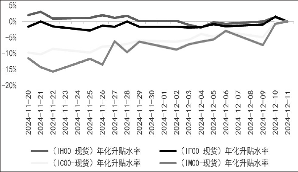 表为2001年以来国内货币政策和财政政策定调与股指表现 12月10日,A股主要指数大幅高开,但随之出现持续回落。我们认为,本次会议定调是原先政策思路的进一步巩固,相较之前,资金更为理性。在9月底启动的那轮上涨行情中,股指的估值水平有了较大提升,若后市指数出现突破性上涨,则需要基本面持续好转的验证。同时,未来海外风险的不确定性加大。 12月股指期货贴水先缩小后扩大。12月初,股指以震荡上行为主,在此过程中,股指期货贴水整体以缩小为主,特别是IC和IM合约。其中,IC2412合约年化贴水率从12月2日的-6.38%缩小至12月6日的-3.17%,IM2412合约年化贴水率从12月2日的-8.90%缩小至12月6日的-3.03%。12月6日以后,随着行情出现转弱迹象,贴水率转为扩大。其中,IC2412合约年化贴水率从12月6日的-3.17%扩大至12月9日的-4.95%,IM2412合约年化贴水率从12月6日的-3.03%扩大至12月9日的-7.48%。我们认为,在行情上涨以及到期日临近的情况下,IH和IF合约有可能短期转为升水,而IC和IM合约贴水有望明显缩小,机构套期保值的成本有望下降。