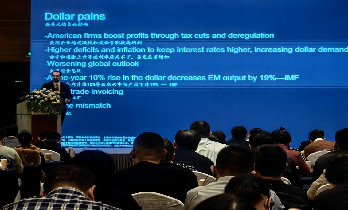 论坛分为上半场和下半场,共邀请6位外部嘉宾,分享了对国际宏观和原油市场的看法。上半场中,Plenum Research的创始合伙人薄正源先生结合特朗普内阁人选特征及其政策表态,回顾特朗普1.0时期对华关税具体情况,对相关领域进行了展望。《经济学人》中国商业和金融编辑Don Weinland回顾2024年全球面临的风险,包括多国选举、气候变化和地缘冲突等,认为2025年全球经济风险需要关注加关税、强美元、高债务等系统影响。最后,由薄正源、Don Weinland与伦敦证券交易所Paul Charmatz以“特朗普2.0对全球事务有何影响”为主题进行共同探讨。