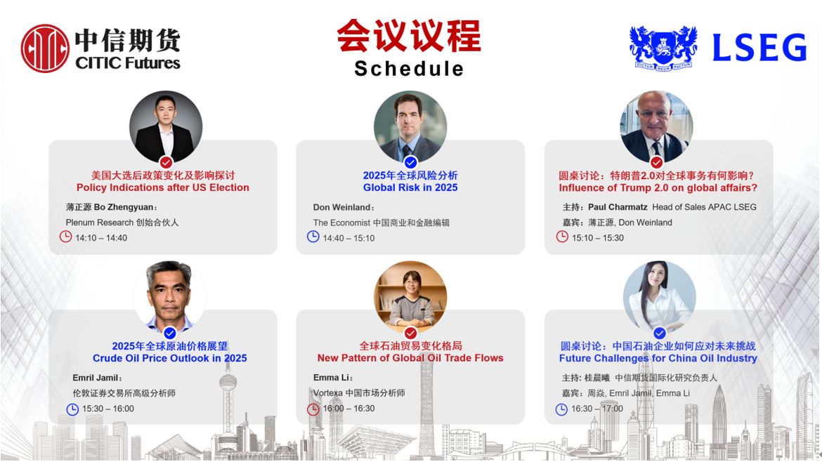 下半场以原油为主题,伦敦证券交易所高级分析师Emril Jamil认为目前市场对需求存忧,WTI原油价格相对低估。展望未来,Emril Jamil认为美国关税政策,或将支撑WTI价差。Vortexa中国市场分析师Emma Li以“全球石油贸易格局展望”为主题,结合专业数据分享了全球原油和成品油的贸易情况。圆桌环节以“中国石油企业如何应对未来的挑战?”为主题,中信证券投资银行委员会能源化工与新材料行业组总监周焱博士,从投资银行视角,为中国能化企业资产重组及海外业务运营提供发展思路。中信期货研究所国际化研究组负责人桂晨曦博士针对引出来和走出去客户的国际化研究服务做业务介绍。