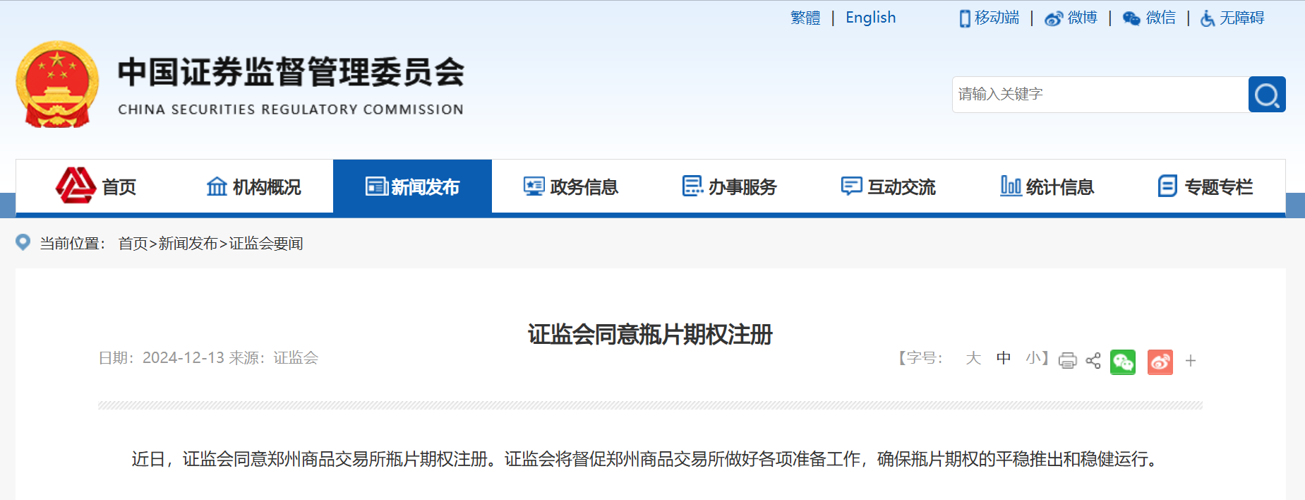 近日,证监会同意郑州商品交易所瓶片期权注册。证监会将督促郑州商品交易所做好各项准备工作,确保瓶片期权的平稳推出和稳健运行。