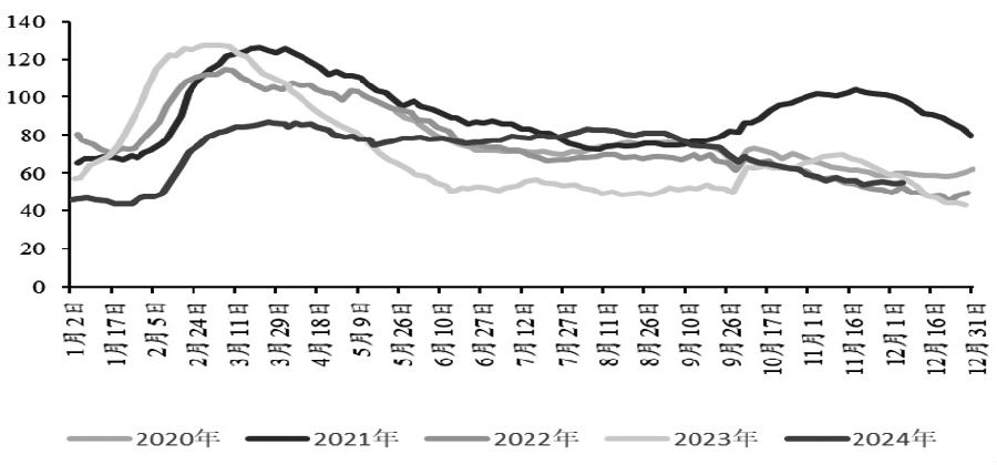图为氧化铝进口盈亏(单位:元/吨) 据市场调研,中国电解铝行业即时理论生产总成本(含税)约为21100元/吨,电解铝即时利润亏损接近800元/吨,目前电解铝厂家因生产成本高企亏损比例已超过30%。 截至2024年11月底,我国电解铝建成产能4528.85万吨,运行产能4393万吨,产能利用率为97.59%。电解铝供给已接近4400万吨,在电解铝产能4550万吨天花板限制下,后续电解铝产能提增空间非常有限,部分地区电解铝产能因高成本难以承受及电力限制等因素有减产检修,但对整体电解铝开产产能影响不大,电解铝保持高产,但更多都转化为铝水不落地直接铸棒、铸合金,相对可交割铸锭消化压力较轻。 需求端:年内难有超预期表现 截至2024年10月底,电解铝初级产品下游开工率情况明显分化,铝杆铝板带箔开工率高出往年同期水平,铝型材开工率表现不及预期,传统用铝消费疲软,电力基建、新能源消费提供支撑。年内初级铝制品出口情况表现较好,11月未锻造铝材出口数量环比增加15.3%,同比增加36.6%,主要原因为特朗普新政府表示将更新对华关税政策的内容。另外,国内发布《关于调整出口退税政策公告》,取消铜铝材产品出口退税。11月出现了抢出口现象,进入12月,电解铝社会库存去化节奏明显放缓,叠加临近跨年淡季消费,铝市需求在进入农历新年前难有超预期表现。