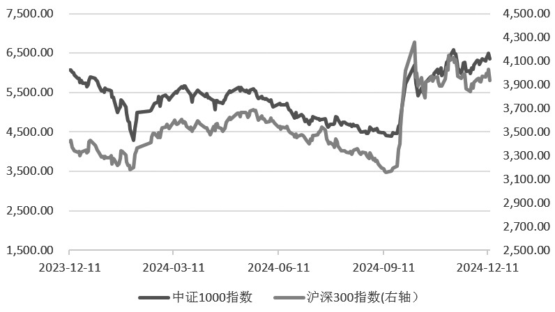 近期,A股以人形机器人为代表的科技板块和以食品饮料为代表的泛消费板块持续活跃,带动指数中枢震荡上行,成交整体活跃。岁末年关时节,市场的这些特性,既是投资者对明年产业转型发展预期的映射,又是市场对明年政策预期的集中体现。我们认为,中期来看,市场情绪或与利好政策形成共振,股指预计呈现震荡上行走势。 随着12月中央政治局会议以及中央经济工作会议落幕,2025年的政策基调、经济发展路径等逐渐明朗。综合来看,两次会议的政策力度基本符合市场预期。中央政治局会议释放多项重磅信号:第一,宏观政策“更加积极有为”,时隔多年再次提出“适度宽松的货币政策”,首次提出“加强超常规逆周期调节”;第二,提出“稳住楼市股市”,把稳定股票市场作为明年经济工作的重点之一;第三,把“大力提振消费”放到了更靠前、更重要的位置。 具体来看,两次会议均指出,要大力提振消费、提高投资效益,全方位扩大国内需求,这意味着2025年扩内需政策着力点是消费。预计明年财政将加大对消费品以旧换新等政策的支持力度。货币政策方面,中央政治局会议提出“适度宽松的货币政策”,我国在过去的14年中持续实施了稳健的货币政策,本次会议确认了积极的货币政策,表明2025年国内降息空间将进一步打开。在此基础上,以个人养老金为代表的长期资金入市积极性不断提高,为市场流动性宽松提供保障。因此,短期和长期国债利率快速下行,带动债券价格逆市走强,而A股方面,以科技为代表的中小盘风格在宽松的环境下中长期将相对占优。 需要注意的是,大盘的上涨需要利好政策落地或者产生实际效果,但是小盘股与预期关联度更高。中证1000越过10月8日的高点,说明政策利好是超预期的,而以沪深300为代表的大盘指数冲高回落,主要原因在于除12月美联储降息25BP预期外,国内市场预期年内政策基本出尽,即降准降息的落地或待来年。 整体来看,当前决策者对经济政策与资本市场的态度转变,以及经济将在中长期向好,正成为股市出现行情和底部抬高的坚实基础。盘面上,短期受获利了结情绪影响,期指价格和持仓跟随指数调整,后市在贴水程度较深的IC和IM品种上可考虑多头替代策略,逐步布局市场修复行情。中长期来看,在流动性充裕的背景下,投资者或可适当关注IM—IH的多空套利机会。