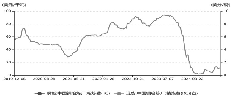 图为电网基本建设投资完成额走势 2024年,在美联储降息周期开启的大背景下,供应紧张、需求提升等因素支撑铜价一路攀升,并创下了历史高点。2024年5月份LME铜价更是创下了11104.5美元/吨的最高点,沪铜创下88940元/吨的最高点。而自9月末开始,铜价自年内次高点回落,近期在诸多影响因素出现反复的情况下,铜价保持震荡态势。我们认为,在美联储12月降息25个基点基本确定、国内宏观政策利好频出下,铜价将保持偏强运行态势。 美联储12月降息25个基点基本确定 现阶段,美国经济保持良好发展态势。美国劳工统计局公布的就业形势报告显示,11月非农大幅反弹程度强于市场预期,失业率如期走高至4.2%。具体数据显示,美国11月季调后非农就业人口增加22.7万人,为4月以来最大增幅,高于市场预期的20万人,10月数据从1.2万人上修至3.6万人。非农就业报告是美联储议息会议前最重要的数据之一,数据公布后,市场加大了对美联储12月降息的押注,交易员认为美联储降息的可能性为85%,报告发布前为67%。 我们认为,由于失业率上升,为了保持降息政策的连续性,美联储12月17—18日降息25个基点基本确定,这将利好铜价走势。 国内政策预期宽松利好铜需求 近日,中共中央政治局召开会议,会议强调,实施更加积极有为的宏观政策,扩大国内需求,推动科技创新和产业创新融合发展,稳住楼市股市。实施更加积极的财政政策和适度宽松的货币政策,充实完善政策工具箱,加强超常规逆周期调节,打好政策“组合拳”,提高宏观调控的前瞻性、针对性、有效性。 会议称,国内全年GDP增速将达到4.9%,保持2025年GDP增速在5%左右,这也基本保障了国内经济保持平稳发展的态势。我们预计,2025年,在美国引发的贸易壁垒逐步增强的前提下,中国消费将稳定增长,房地产行业将受到政策扶持,重大基建和固定资产投资将有所上升,尤其是在电力基础建设投资上将有较大增长。电力行业占铜总消费50%左右,截至10月31日,电网基本建设投资完成额累计值4502亿元,已经超出了2023年前11个月的累计完成额4458亿元,表明2024年电网建设投资将再上台阶,对铜需求将起到决定性的提升作用。 加工费呈下降趋势 截至12月6日,中国铜冶炼厂粗炼费(TC)为10.8,精炼费(RC)为1.08,加工费保持在低位,显示目前供应仍紧张。