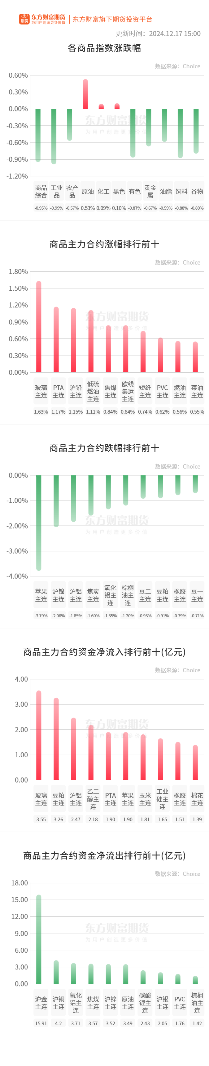 行情纵览![]() 宏观产经新华社:美国当选总统特朗普16日说,美中两国联手可以解决世界上所有问题。特朗普当天在佛罗里达州海湖庄园举行记者会时作出上述表态。“中国和美国可以一起解决世界上所有问题,你想一想,这很重要。”特朗普说。 新华社:国家移民管理局12月17日发布公告,即日起全面放宽优化过境免签政策,将过境免签外国人在境内停留时间由原72小时和144小时均延长为240小时(10天),同时新增21个口岸为过境免签人员入出境口岸,并进一步扩大停留活动区域。 央行网站:2024年12月15-16日,中美金融工作组在江苏省南京市举行第七次会议。会议由中国人民银行副行长宣昌能和美国财政部助理部长奈曼共同主持。国家金融监督管理总局、中国证监会,以及美联储、美国证券交易委员会等部门参会。 品种资讯黑色系期货 煤炭:根据中国煤炭工业协会统计与信息部统计数据显示,1-11月排名前10家企业原煤产量合计为21.6亿吨,同比减少2322万吨,占规模以上企业原煤产量的50.0%。(中国煤炭工业协会) 铁矿石:卫星数据显示,2024年12月9日-12月15日期间,澳大利亚、巴西七个主要港口铁矿石库存总量1125.5万吨,环比下降45.9万吨,库存连续两期去库,绝对量处于四季度以来的偏低水平。(Mysteel) 12月17日Mysteel统计中国47港进口铁矿石库存总量15658.86万吨,较上周一下降87.67万吨。(Mysteel) 农产品期货 棕榈油:印度尼西亚11月棕榈油出口环比下降11.21%。(财联社) 大豆:上周国内油厂大豆库存上升、豆粕库存下降。监测显示,12月13日,全国主要油厂进口大豆商业库存661万吨,周环比上升59万吨,月环比上升78万吨,同比上升132万吨,较过去三年均值高205万吨。主要油厂豆粕库存65万吨,周环比下降4万吨,月环比下降14万吨,同比下降23万吨,较过去三年同期均值高4万吨。(国家粮油信息中心) 豆油:美国油籽加工商协会(NOPA):美国2024年11月豆油库存为10.84亿磅,市场预期为11.23亿磅,10月为10.69亿磅;美国2024年11月大豆压榨量为1.93185亿蒲式耳,市场预期为1.96713亿蒲式耳,10月为1.99959亿蒲式耳,2023年11月为1.89038亿蒲式耳。(新华财经) 有色/贵金属期货 沪铝:据SMM获悉,铝板带产业重地郑州环保检查风波再起。本次检查力度大,要求高,当地多家铝板带企业表示已按要求限产,复产时间尚未确定。(SMM) 沪铅:2024年12月16日起,安徽省淮河以北及江淮西部预计将出现一轮中度-重度污染过程,经研究决定发布重污染天气省级橙色预警,于12月16日0时启动省级Ⅱ级响应。据调研,安徽地区再生铅炼厂今日表示本次天气预警需要停产配合,复产日期需要观察天气变化;预计产量下滑超过2000吨/天。(SMM) 能化期货 聚丙烯:2024年12月4日,印度尼西亚反倾销委员会发布公告称,对原产于中国、马来西亚、越南、泰国、新加坡、沙特、菲律宾和南非的聚丙烯均聚物(PP Homopolymer)启动反倾销调查。涉案产品的印尼税号为3901.10.40。(中国贸易救济信息网) PTA:下游产销火爆带动市场情绪,PTA现货收涨至4841附近。近期聚酯企业产销火爆,低库存下降负意愿不强,阶段性供需结构改善,且成本端支撑强烈,短期国内PTA现货市场延续偏强格局,预计华东PTA现货商谈价格在4850-4950。(隆众资讯) 原木:据木联数据统计,12月9日-12月15日,中国7省13港针叶原木日均出库量为5.68万立方米,较上周增10.51%。(木联数据) 晚间关注无 (文章来源:东方财富研究中心) (责任编辑:迷你学人) |