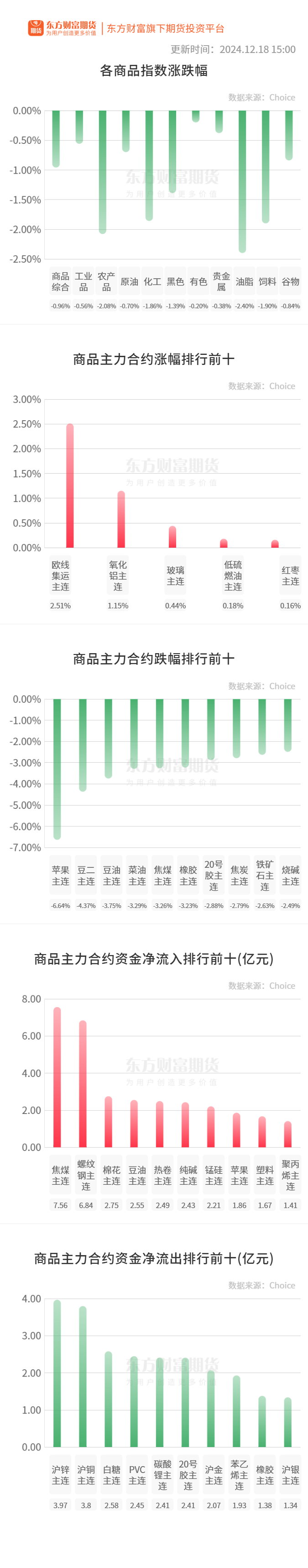行情纵览![]() 宏观产经21财经:21世纪经济报道记者从业内了解到,18日上午,央行约谈了本轮债市行情中部分交易激进的金融机构,提出了一些要求,主要包括:要密切关注自身利率风险等风险状况,提高投研能力,加强债券投资稳健性;依法合规开展投资交易,央行近期已经严厉查处了一批涉嫌出借账户、扰乱市场价格、利益输送、内控缺失等违规行为的机构,同时正在全面摸排违规行为线索,后续将保持常态化的执法检查,对债券市场违法违规行为零容忍。 财联社:今日24时新一轮成品油调价窗口开启。据国家发展改革委价格监测中心监测,本轮成品油调价周期内(12月4日—12月17日),国际油价继续小幅波动。按现行国内成品油价格机制测算,调价金额每吨不足50元,本次汽、柴油价格不作调整,未调金额纳入下次调价时累加或冲抵。 品种资讯黑色系期货 煤炭:IEA表示,到2027年,煤炭需求将继续创下纪录。(财联社) 12月16日起,受北方大范围静稳天气和冷空气南下影响,全国安徽、山东、陕西、山西等6省份26市发布重污染天气预警,全国多地陆续迎来“停工、停产、停运”风潮。据悉,多地明确表示要暂停矿山、洗煤厂等露天作业。(SMM) 硅铁:宝钢12月18日招标硅铁1200吨,其中宝山基地400吨,梅山基地100吨,湛江基地250吨,武钢75#硅铁350吨,武钢75#精炼硅铁100吨。(Mysteel) 农产品期货 棕榈油:中国11月棕榈油进口量为17万吨,同比减少61.4%;1-11月累计进口量为248万吨,同比减少38.6%。(海关总署) 白糖:中国11月食糖进口量为53万吨,同比增加21.9%;1-11月累计进口量为396万吨,同比增加13.8%。(海关总署) 2024年12月17日,印度商工部发布公告称,应申请方于2024年12月10日提交的撤回调查申请,因此决定终止对原产于或进口自中国糖精(Saccharin)的反倾销调查。(中国贸易救济信息网) 油脂:截至12月13日,国内三大油脂商业库存总量192万吨,周环比回升1万吨,月环比下降12万吨,同比下降35万吨。(国家粮油信息中心) 有色/贵金属期货 氧化铝:据SMM获悉,自12月19日起山东某大型氧化铝厂调整32%的离子膜液碱收货价格,在840元/吨的基础上下调20元/吨;即两票制出厂执行820元/吨(折百价约为2563元/吨)。(SMM) 中国11月氧化铝出口量为19万吨,同比增长56.7%;1-11月累计出口量为160万吨,同比增长42.5%。(海关总署) 碳酸锂:上海钢联发布数据显示,今日电池级碳酸锂(早盘)价格较上日下跌200元,均价报75800元/吨。(南方财经网) 不锈钢:据SMM调研了解,华南某不锈钢厂拟定于2025年1月1日起全面停产检修,为期一个半月,预计影响产量300系约4.5万吨,200系约7.5万吨,总计12万吨。(SMM) 能化期货 沥青:截至12月18日当周,中国沥青炼厂产能利用率为28.5%,环比下降1.2%,沥青周产量为50.1万吨,环比下降4.4%。(隆众资讯) 甲醇:截至2024年12月18日,中国甲醇港口库存总量在107.03万吨,较上一期数据减少1.47万吨。其中,华东地区去库,库存减少1.4万吨;华南地区去库,库存减少0.07万吨。(隆众资讯) 原木:中国11月原木进口量为284万立方米,同比减少9.8%。1-11月累计进口量为3304万立方米,同比减少5%。(海关总署) 晚间关注无 (文章来源:东方财富研究中心) (责任编辑:迷你学人) |