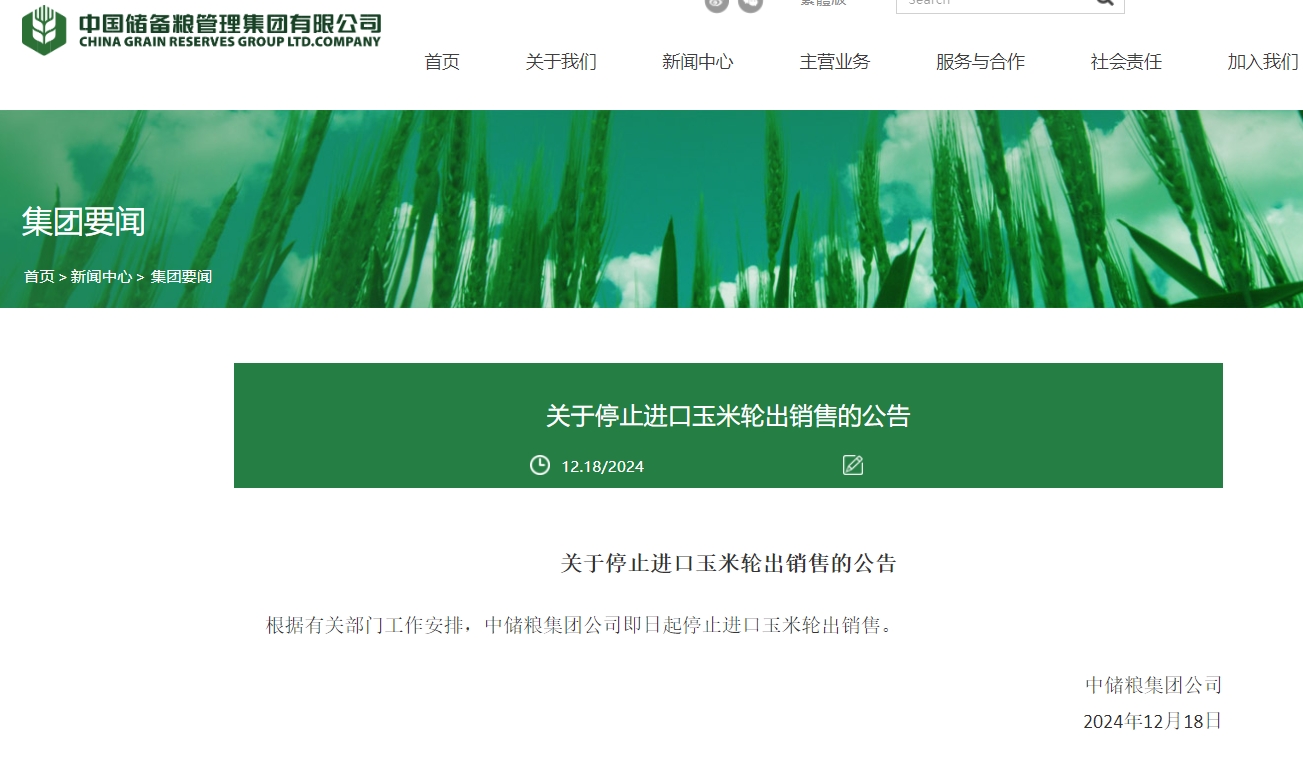 中储粮集团:即日起停止进口玉米轮出销售 财联社 12月18日 12月18日,中储粮集团公司发布公告称,根据有关部门工作安排,中储粮集团公司即日起停止进口玉米轮出销售。(文章来源:财联社) (责任编辑:迷你学人)