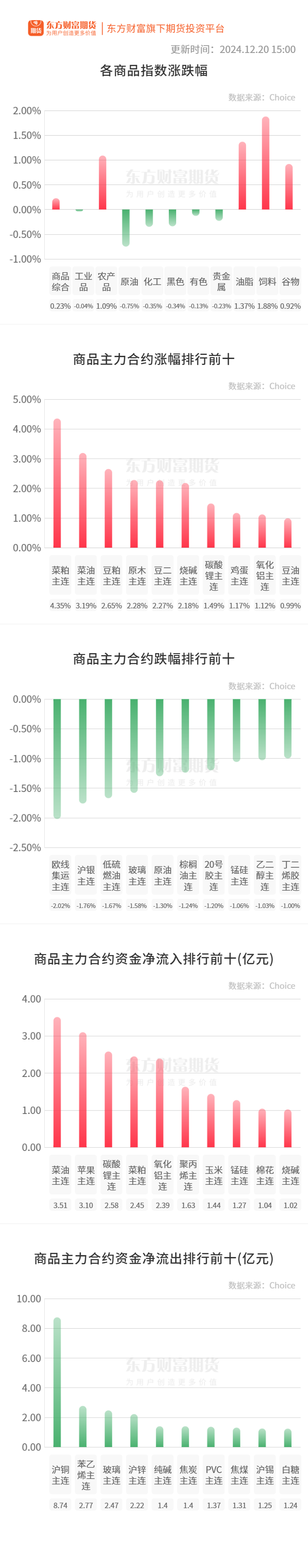 行情纵览![]() 宏观产经澎湃新闻:12月20日,中国人民银行授权全国银行间同业拆借中心公布,2024年12月20日贷款市场报价利率(LPR)为:1年期LPR为3.10%,5年期以上LPR为3.60%,均较前期保持一致。以上LPR在下一次发布LPR之前有效。2024年全年,1年期和5年期以上贷款市场报价利率分别下降了35个基点和60个基点。 财联社:上午,短端国债十分活跃。1年期国债活跃券“24贴现国债73”下行7bp报1.03%;非活跃券“22附息国债04”收益率下行10bp触及1%。数据显示,对比同期限中债到期收益率,为2009年7月3日以来新低。 品种资讯黑色系期货 铁矿石:河南省林州市2家铸造用生铁企业接到通知进行环保管控,管控仅对烧结机有30%-50%的生产限制,于2024年12月20日开始至2025年1月10日结束。其中1家企业高炉因有检修计划,将于2024年12月21日开始停产,复产时间待定,影响生铁产量日均约为0.16万吨,河南其他企业高炉生产均无影响。(Mysteel) Mysteel统计全国45个港口进口铁矿石库存总量14974.48万吨,环比降92.89万吨,45港日均疏港量324.25万吨,环比降12.88万吨。全国47个港口进口铁矿库存为15674.48,环比降62.89;日均疏港量340.05降11.72。分量方面,澳矿6540.71降56.29,巴西矿6262.21增16.39;贸易矿9985.38降80.55,粗粉12119.64降96.26;块矿1977.00降1.28,精粉1156.14增50.92,球团421.70降16.27,在港船舶数90条降12条。(单位:万吨)(Mysteel) 锰硅:2024年11月锰矿进口:总量220.16万吨,环比下降24.88%,同比下降12.94%。11月澳矿10.12万吨,环比涨64.3%;南非矿123.83万吨,环比降26.62%;加蓬矿34.52万吨,环比降17.58%;加纳矿30.55万吨,环比降24.36%;巴西矿10.53万吨,环比降32.61%,缅甸矿4.18万吨,环比增868.82%。2024年1-11月锰矿进口总量约2679.56万吨,同比(2023年1-11月进口约2866.88万吨)降187.32万吨,同比降6.53%。(海关总署) 焦煤:本周Mysteel统计全国247家钢厂样本:焦炭日均产量46.85增0.02,产能利用率86.5%增0.03%;焦炭库存631.59增8.04,焦炭可用天数12.5天增0.45天;炼焦煤库存758.99增2.97,焦煤可用天数12.18天增0.04天;喷吹煤库存412.97增5.06,喷吹可用天数12.72天增0.31天。(单位:万吨)(Mysteel) 钢材:Mysteel调研247家钢厂高炉开工率79.63%,环比上周减少0.92个百分点,同比去年增加1.92个百分点;高炉炼铁产能利用率86.13%,环比上周减少1.15个百分点,同比去年增加1.38个百分点;钢厂盈利率48.48%,环比上周增加0.43个百分点,同比去年增加14.71个百分点;日均铁水产量 229.41万吨,环比上周减少3.06万吨,同比去年增加2.77万吨。(Mysteel) 农产品期货 棕榈油:据马来西亚独立检验机构AmSpec,马来西亚12月1-20日棕榈油出口量为889992吨,较上月同期出口的963302吨减少7.61%。(新华财经) 据船运调查机构ITS数据显示,马来西亚12月1-20日棕榈油出口量为900004吨,较上月同期出口的981687吨减少8.32%。(新华财经) 菜籽:据加拿大谷物委员会发布的数据显示,截至12月15日当周,加拿大油菜籽出口量较前一周增加24.7%至17.48万吨。(新华财经) 豆粕:据监测,2025年4月船期巴西大豆出口至中国的CNF报价391美元/吨,华南地区进口到港完税成本3245元/吨,比进口12月船期美豆完税成本低200~350元/吨。按照7500元/吨的豆油价格计算,油厂盈亏平衡时,豆粕售价在2500元/吨左右。(国家粮油信息中心) 有色/贵金属期货 沪银:上海黄金交易所公告,为促进白银市场发展,降低会员及客户成本,上海黄金交易所决定继续免收会员及客户白银合约交割费、白银合约运保费和白银租借服务费。以上费用具体免收期为:2024年最后一个交易日日终清算后至2025年最后一个交易日日终清算前。(界面新闻) 沪铝:2024年11月中国进口铝土矿1235.0万吨,环比增加0.5%,同比增加3.6%。分国别看,自几内亚进口800.0万吨,环比增加5.3%,同比减少0.1%;自澳大利亚进口350.8万吨,环比减少5.1%,同比增加0.2%;自老挝进口21.5万吨,自土耳其进口14.4万吨,自加纳进口12.6万吨,自巴西进口12.3万吨,自马来西亚进口11.3万吨,自印度进口5.0万吨,自科特迪瓦进口5.0万吨,自牙买加进口2.0万吨。(海关总署) 碳酸锂:据海关数据,11月中国进口碳酸锂19235吨,环比减少17%,同比增加13%。1-11月累计进口206922吨。11月具体进口情况,从智利进口碳酸锂12189吨,占比63%;从阿根廷进口6270吨,占比33%。(海关总署) 氧化铝:据上海有色网(SMM)统计,截至12月20日国内港口氧化铝库存共计8.1万吨,较前一周减少0.9万吨。(上海有色网) 多晶硅:据海关总署数据,2024年11月,多晶硅出口量3948.43吨,环比上升8.95%,同比上升124.82%;多晶硅出口额为34930773美元,环比上涨13.18%,同比上升96.98%,出口均价为8846..76美元/吨。(海关总署) 能化期货 苯乙烯:截至12月19日当周,中国苯乙烯工厂整体产量在32.91万吨,环比增加0.39万吨,增幅为1.2%;工厂产能利用率73.53%,环比上涨0.87%。(隆众资讯) 原木:12月19日,全国18港针叶原木到船2条,到港总量约7.6万方,较2024年日均1.73条船4.98万方,分别高出16%与53%。(木联数据) 原油:据英国金融时报,随着伊朗石油供应停止,叙利亚最大的炼油厂停止运营。(财联社) 晚间关注21:30 美国:核心PCE物价指数当月同比 (文章来源:东方财富研究中心) (责任编辑:迷你学人) |