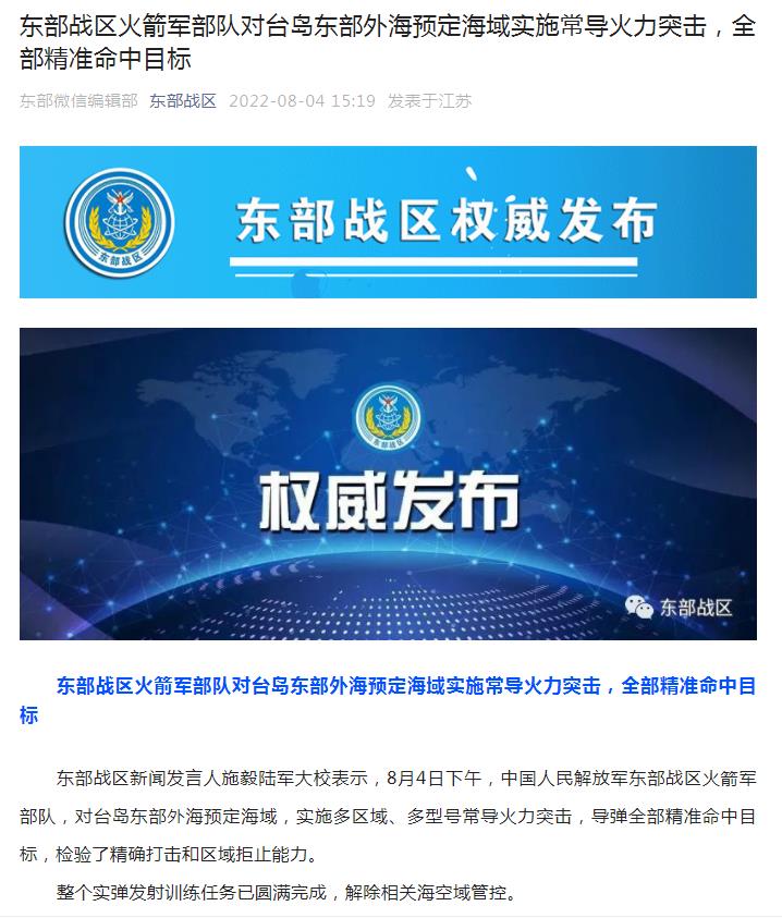 东部战区火箭军部队对台岛东部外海预定海域实施常导火力突击 全部精