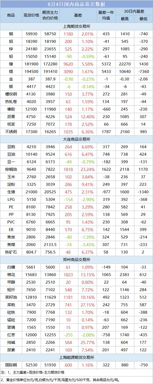 基差报告:8月4日国内商品基差数据一览