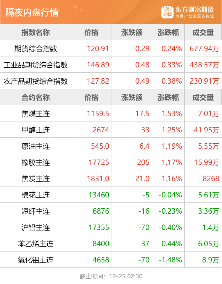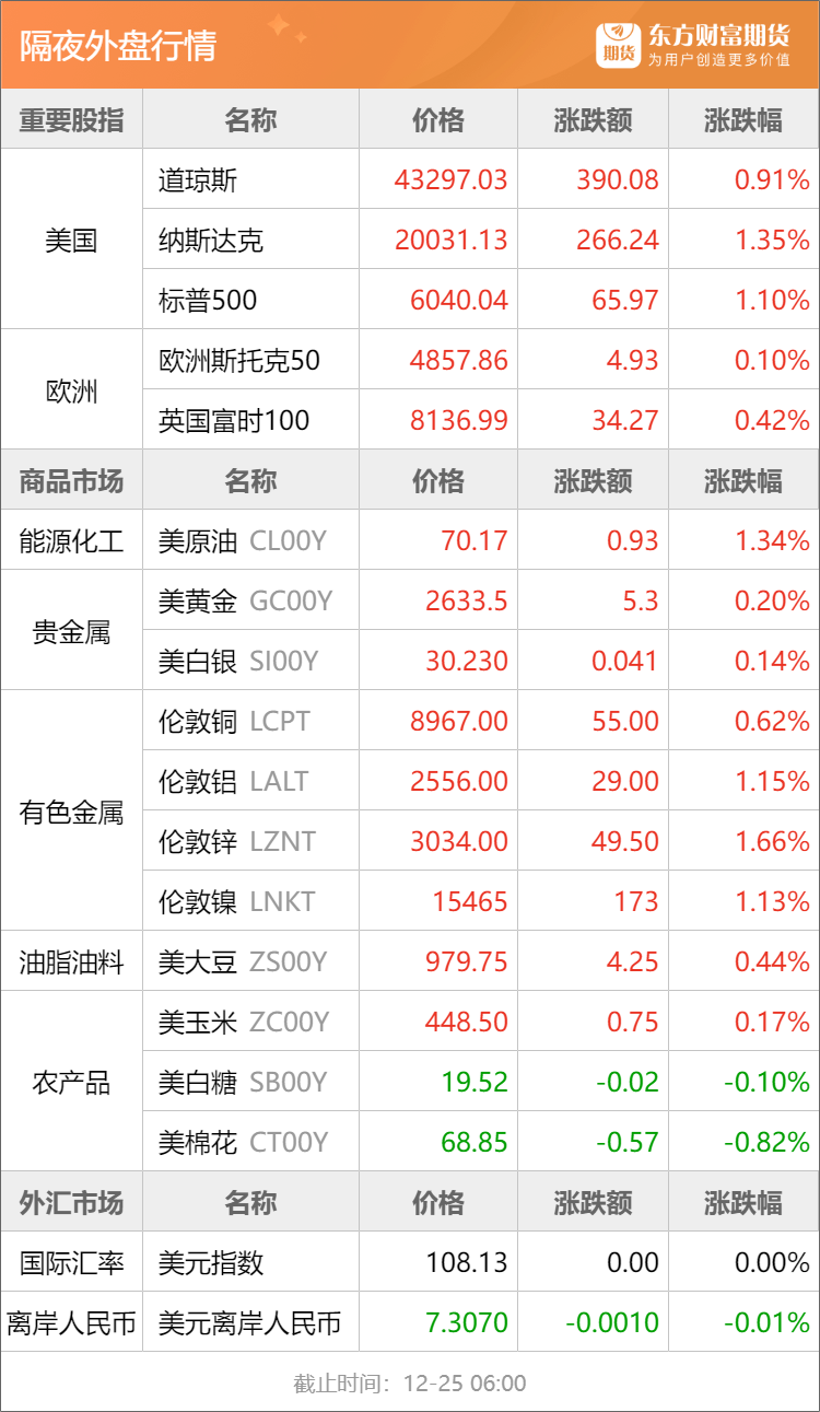 隔夜行情![]() ![]() 因假期,芝商所旗下贵金属、美国原油期货合约提前收盘,于北京时间12月25日02:45休市。 每日精选广期所:多晶硅期货将于12月26日上市交易 挂牌基准价38600元/吨 市场风云突变!国债期货午后突然跳水 有何消息刺激? 年内猪价走出“倒V” 生猪养殖终于赚钱了! 宏观产经央视网:李强主持召开国务院常务会议,审议通过《国务院关于规范中介机构为公司公开发行股票提供服务的规定(草案)》。会议强调,要发挥好中介机构资本市场“看门人”作用,防止中介机构与发行人不当利益捆绑,严厉打击财务造假、欺诈发行等违法行为,切实保护投资者合法权益,促进资本市场健康稳定发展。 财政部网站:全国财政工作会议在北京召开。会议指出,2025年要实施更加积极的财政政策,持续用力、更加给力,打好政策“组合拳”。一是提高财政赤字率,加大支出强度、加快支出进度。二是安排更大规模政府债券,为稳增长、调结构提供更多支撑。三是大力优化支出结构、强化精准投放,更加注重惠民生、促消费、增后劲。四是持续用力防范化解重点领域风险,促进财政平稳运行、可持续发展。五是进一步增加对地方转移支付,增强地方财力,兜牢基层“三保”底线。 中国证券报:国家发展改革委网站12月24消息,国家发展改革委办公厅近日印发《关于进一步做好政府和社会资本合作新机制项目规范实施工作的通知》,旨在进一步推动政府和社会资本合作(PPP)新机制落实落细,推进PPP新机制项目规范有序实施。 品种资讯黑色系期货 螺纹钢:12月24日,76家独立电弧炉建筑钢材钢厂平均成本为3466元/吨。平均利润为-52元/吨,谷电利润为65元/吨,日环比增加1元/吨。(Mysteel) 12月24日,长江钢铁对合肥地区建材出厂价调整如下:1、螺纹上调10元:现Φ18mm抗震螺纹价格为3580元/吨;2、盘螺上调10元:现Φ8mm 抗震盘螺价格为3760元/吨;3、线材上调10元:现Φ8mm 抗震盘螺价格为3760元/吨;以上调整均为含税,自2024年12月24日起执行。(西本新干线) 铁矿石:12月24日Mysteel统计中国47港进口铁矿石库存总量15613.43万吨,较上周一下降45.43万吨。 卫星数据显示,2024年12月16日-12月22日期间,澳大利亚、巴西七个主要港口铁矿石库存总量1133.8万吨,环比上升8.3万吨,库存小幅回升,目前库存绝对量略低于四季度以来的平均水平。(Mysteel) 动力煤:12月23日,CCTD环渤海动力煤现货参考价5500K、5000K、4500K三个规格品分别收于772元/吨、671元/吨、570元/吨,周环比下跌24元/吨、24元/吨、28元/吨,同比下跌178元/吨、177元/吨、159元/吨,继续刷新今年以来国内动力煤价格的低点。(上海证券报) 农产品期货 生猪:据上海钢联重点养殖企业样本数据显示,2024年12月24日重点养殖企业全国生猪日度出栏量为278720头,较前一日下跌2.06%。(新华财经) 国家统计局数据显示,据对全国流通领域9大类50种重要生产资料市场价格的监测显示,2024年12月中旬与12月上旬相比,20种产品价格上涨,28种下降,2种持平。其中,12月中旬生猪(外三元)价格环比下降0.6%。(财联社) 截至12月24日14:00时,全国农产品批发市场猪肉平均价格为22.63元/公斤,比昨天下降1.2%。(农业农村部) 棉花:截止2024年12月22日,全国皮棉累计加工量567.6万吨,同比增长19.3%。新疆地区皮棉累计加工总量558.4万吨,同比增长19.8%。自治区皮棉加工量385.2万吨,同比增长27.3%;兵团皮棉加工量173.2万吨,同比增长6.1%。内地累计加工量为9.2万吨,同比下降7%。(中国棉花协会) 棕榈油:印尼棕榈油行业协会GAPKI公布的数据显示,印尼10月棕榈油出口量为289万吨,较去年同期的301万吨有所下降,但较9月修正后的226万吨有所改善。(新华财经) 有色/贵金属期货 工业硅:大全能源官微发布公告称,当前,多晶硅供求失衡的市场格局依然未得到根本性改善,行业整体持续面临全面亏损的严峻挑战。为严格落实中央经济工作会议精神,规范企业自身行为,防止“内卷式”恶性竞争,促进光伏行业的健康可持续发展,公司将逐步启动对新疆及内蒙古生产基地高纯多晶硅产线的阶段性检修工作,对部分产线进行有序减产控产。(财联社) 12月24日晚,通威股份官微发布公告称,当前,受西南地区冬季进入枯水期,电力价格环比提升影响,考虑光伏产业总体行情持续处于底部调整阶段,公司旗下永祥股份积极响应中央经济工作会议精神,致力破除“内卷式”竞争,促进光伏产业长期健康发展,逐步安排永祥股份下属云南通威高纯晶硅有限公司、四川永祥多晶硅有限公司、四川永祥新能源有限公司、四川永祥能源科技有限公司4家高纯晶硅生产公司,根据公司总体生产经营计划进行技改及检修工作,阶段性有序减产控产,后续具体复产安排将根据项目地电力价格变化以及市场行情统筹规划。(界面新闻) 沪铝:12月24日广东铝锭库存11.39万吨;无锡铝锭库存17.27万吨;巩义铝锭库存7.95万吨,三地库存共计较上一交易日增加0.05万吨。(上海有色网) 沪铜:12月23日,全球最大铜矿生产商智利国家铜业公司(Codelco)表示,已申请环境许可,以延长其8亿美元的Mistra铜矿的使用寿命。Codelco一直在努力提高产量,过去两年,由于一些关键项目的延迟,其铜产量跌至历史低点。(Mysteel) 能化期货 尿素:山东地区尿素价格小幅波动,小颗粒主流出厂成交1640-1700元/吨。临沂市场一手贸易商出货参考价格1700-1710元/吨附近,菏泽市场参考价格1690-1700元/吨附近。(隆众资讯) 烧碱:24日,主