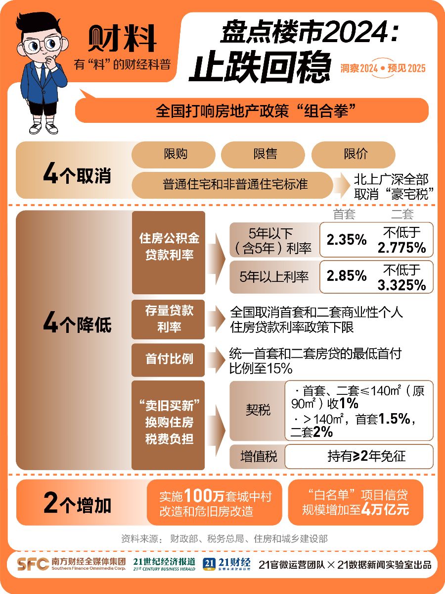 2024年,或许是中国房地产市场有史以来,政策最忙的一年。据中指院统计,截至2024年11月末,从中央到地方陆续出台的房地产调控政策累计逾700次。 这一年,房地产行业政策面发生彻底转变,北上广深带头放松楼市管控,给市场注入信心与活力。这一年,一线城市全面松绑限购,购房最低首付15%,买房降契税,降豪宅税、存量房贷第二次下调等等,都从梦想照进现实。 “止跌回稳”,成为2024年的行业关键词。2024年,楼市发生了哪些重大变化?2025年楼市怎么走?方向已经明确。本期《21财料》带你多图回顾2024年房地产政策“组合拳”。 ![]() ![]() ![]() ![]() (文章来源:21世纪经济报道) (责任编辑:迷你学人) |