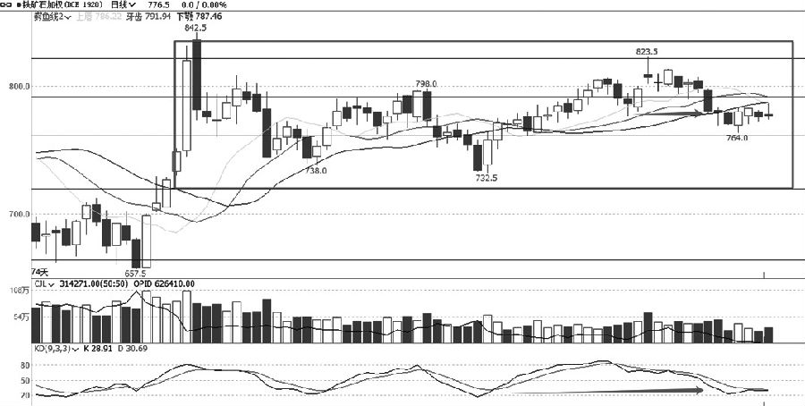 从焦炭加权日线走势来看,自国庆节后一路走低,并跌破前期调整低点,宣告反弹结束,整个下跌过程由大幅波动转为稳定下跌。自12月上旬开始转为震荡走低,均线系统空头排列并有扩散倾向。近期焦炭并未延续跌势,而是小幅震荡走高,呈现强势走低、弱势反弹状态。虽然技术指标有底背离嫌疑,但是走势上出现再创新低迹象。 铁矿石 继续走低